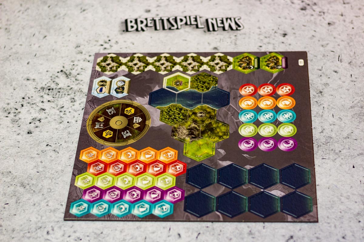Die Schachtel an sich ist eine sehr schlanke und von der Materialstärke her dünne Box. Die Komponenten der Erweiterung passen gerade so in die etwas merkwürdigen Dreieck-Kartons im Inneren hinein. Mit etwas Mühe und vielen kleinen Zippbeuteln lassen sich alle Materialien der Erweiterung mit in die Box des Grundspiels quetschen. Ohne eigene Sortiersysteme oder Kästchen zur Aufbewahrung der vielen verschiedenen Marker wird das schnell zu einem großen Chaos.