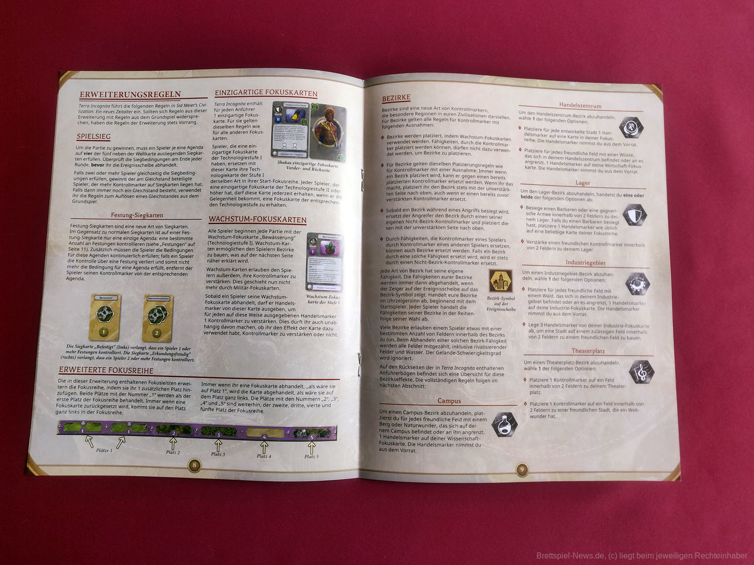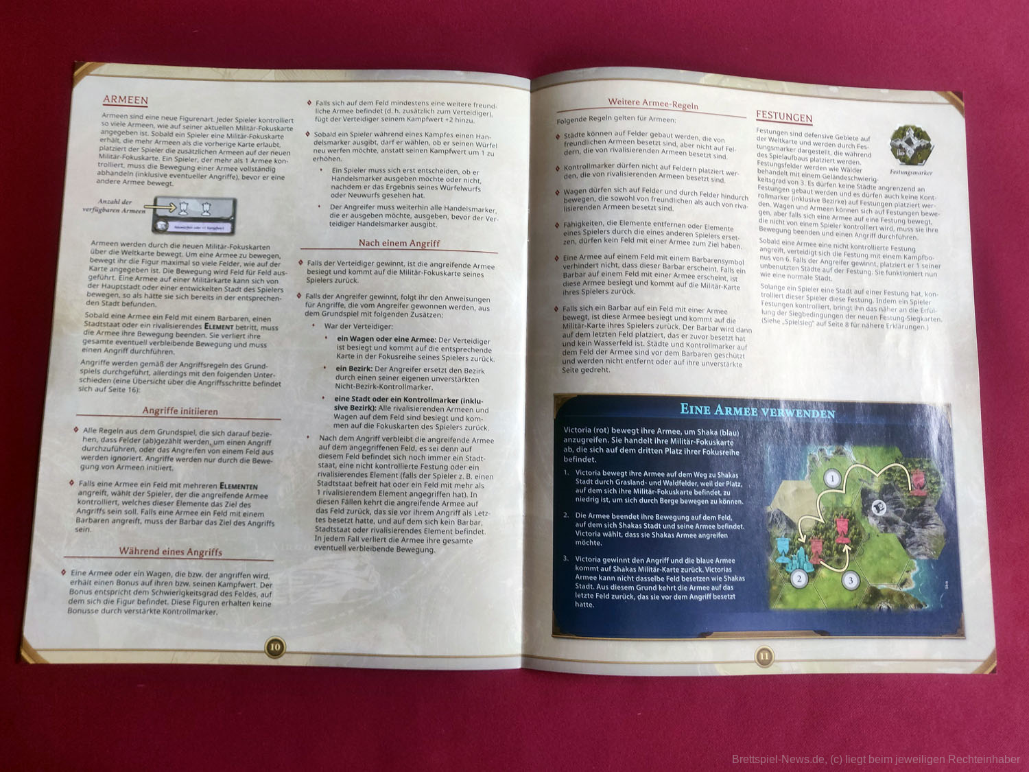 Die Anleitung war einer der großen Kritikpunkte des Grundspiels. Die neue Anleitung folgt dem Prinzip der alten und beschreibt zuerst das Spielmaterial und den neuen Spielaufbau, danach dann die neuen Elemente des Spiels wie Festungen, Bezirke, Armeen und die Erkundung neuer Spielplanteile. Ebenfalls werden einige zentrale Spielbegriffe erklärt und ein paar Klarstellungen zu bestimmten Karten und Fähigkeiten gemacht. Eine Kurzübersicht auf der Rückseite der Anleitung erklärt die Kampfregeln noch einmal etwas kompakter und auch eine Auflistung aller neuen Siegkarten finden wir dort. Eine kompakte Übersicht über Spielzüge fehlt allerdings weiterhin.