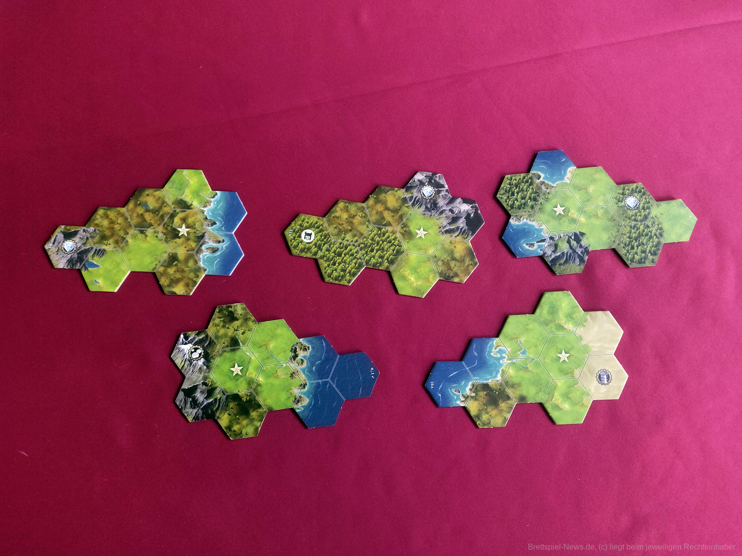 Allerdings wird bereits beim Aufbau klar, dass die TERRA INCOGNITA Erweiterung das Grundspiel komplexer machen wird. Während die Spieler:innen zuvor von Anfang an das gesamte Spielfeld aufgebaut haben, beginnen sie nun mit wenigen zentralen Startteilen, Hauptstadt-Spielplanteilen sowie den neuen Festungsmarkern. Der Rest will erkundet werden.