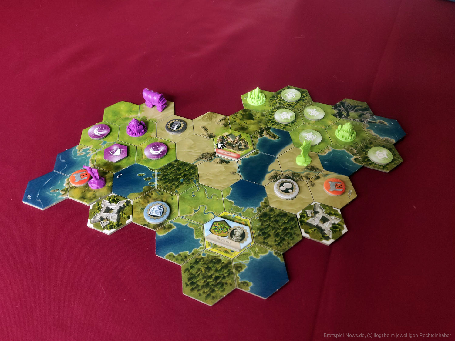 Für mich persönlich ist das Spiel nicht konfrontativ genug. Zwar ermöglichen die Armeen einem etwas direkteren Zugriff auf die Gegner, durch die Erkundung nach außen bauen die Spieler:innen aber weiter voneinander weg, was zu deutlich weniger Reibungspunkten führt. Die neuen Festungen, die dies etwas ausbalancieren und das Militär sind wichtige Aspekte, die man zu keiner Zeit vernachlässigen sollte, jedoch wollen sie sich nicht wirklich geschmeidig in das Spiel integrieren. Sie fühlen sich eben genau so an, als wären sie hauptsächlich dem Spiel hinzugefügt worden, damit die Militärkarten relevanter werden. Dass es in der Videospiel-Vorlage dieses Spielelement ebenfalls nicht gibt, lässt die Festungen noch etwas deplatzierter wirken.