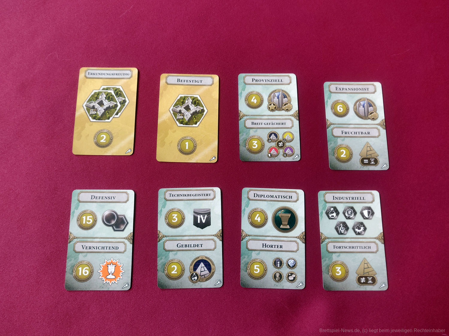 Ziel des Spiels ist es weiterhin, die Zielkarten zu erfüllen (diese heißen neuerdings „Siegkarten“). Von denen gibt es jetzt eine deutlich größere Auswahl, die spielmechanisch aber keine großen Überraschungen bescheren. Es müssen verschiedene Arten von Weltwundern erbaut, eine bestimmte Anzahl an Technologiekarten der Stufe 4 erforscht oder alle Bezirke errichtet werden. Neu sind die zwei Festung-Siegkarten, die in jeder Partie zusätzlich ausgelegt werden. Die Festungen sind also in jedem Spiel relevant. Aber nicht nur darin unterscheiden sich die neuen Siegkarten, denn im Gegensatz zu den normalen können die Spieler:innen die Festung-Siegkarten wieder verlieren, sobald sie diese einmal erfüllt haben. Hinzu kommt, dass nun vier der fünf ausliegenden Ziele erledigt werden müssen.