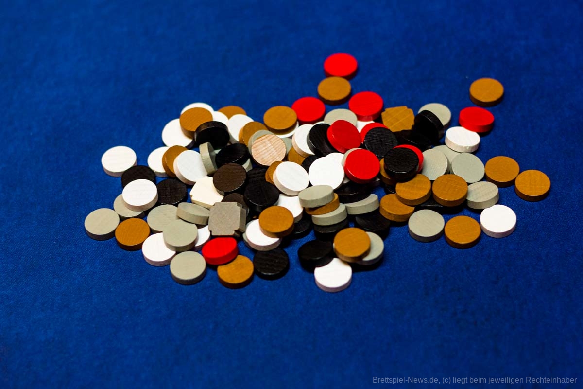 Den Hauptbestandteil der Spielschachtel von SAGANI machen die insgesamt 75 Plättchen aus, die alle aus sehr solider und qualitativ hochwertig bedruckter Pappe bestehen. Zusätzlich zu den Plättchen sind das zentrale Spieltableau und insgesamt 110 Holztoken in den unterschiedlichen Farben der Spielenden (sowie 10 Missklangscheiben in Rot) enthalten.