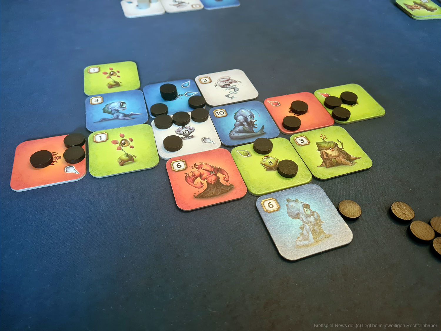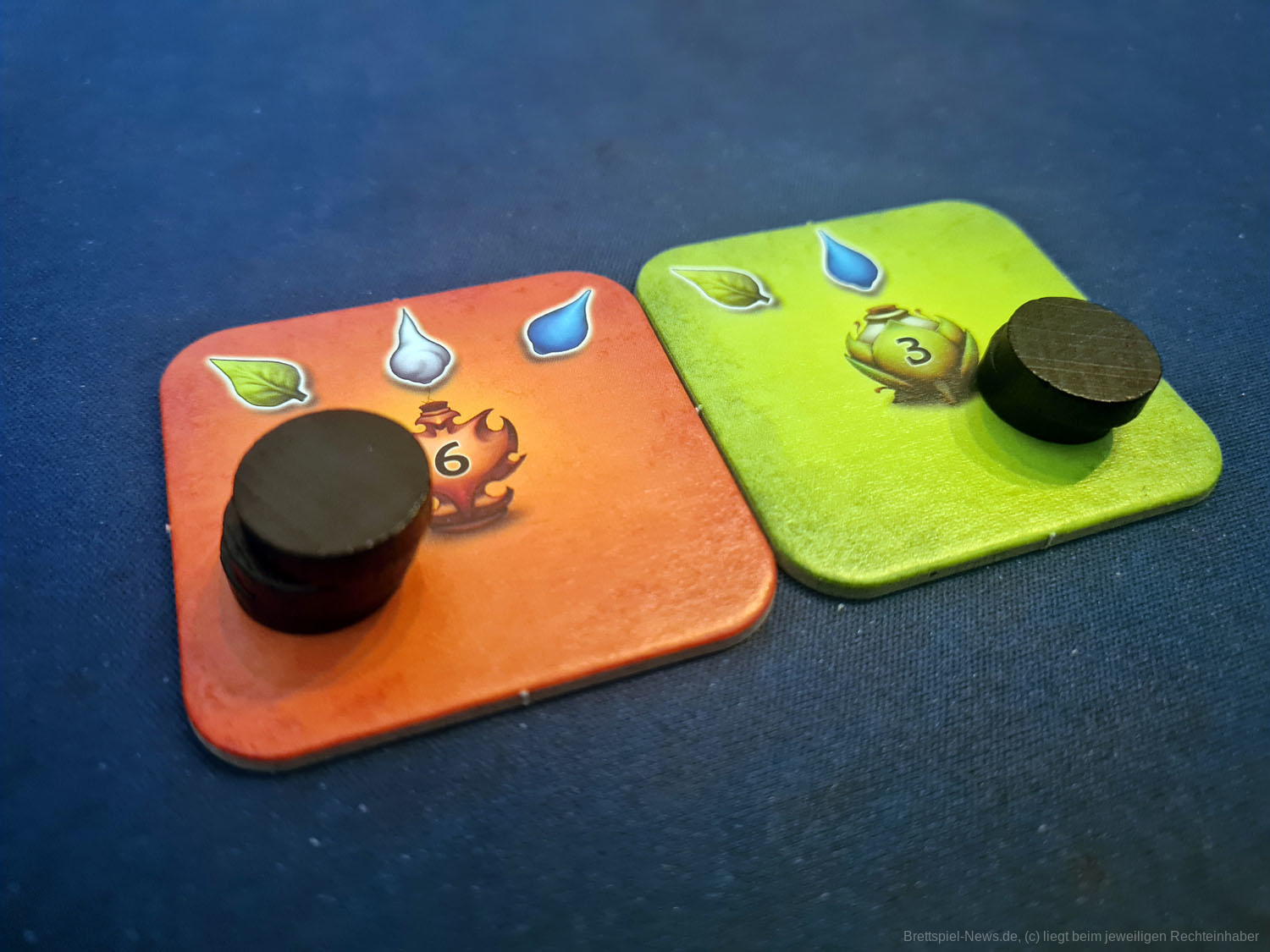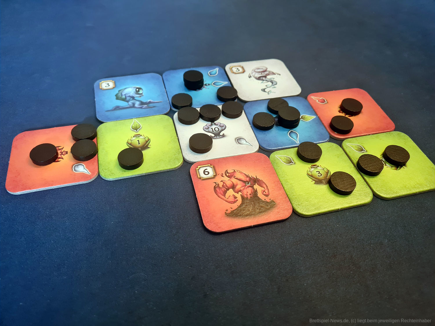 Wie bereits erwähnt wurde, müssen 1 bis 4 Spielende die Plättchen der Naturgeister so geschickt aneinanderlegen, dass ihre Voraussetzungen erfüllt werden, um sich zu entfalten. Die Plättchen der Naturgeister besitzen eine Vorder- und eine Rückseite, die alle nötigen Informationen bereithalten. Auf der Rückseite der Plättchen befindet sich ein kleines Bild des jeweiligen Naturgeistes mit dessen festgeschriebener Siegpunktzahl. Diese Siegpunkte erhalten die Spielenden, sobald sie die Voraussetzungen des Naturgeistes erfüllt haben. Diese Voraussetzungen befinden sich auf der Vorderseite des Plättchens in Form von kleinen farbigen Pfeilen. Jede Farbe passt zu einer Naturgeistart: grün für Wald, rot für Feuer, blau für Wasser und weiß für Wind. Je höher die Punktzahl des Naturgeistes ist (1,3,6 oder 10 Punkte) desto mehr Pfeile befinden sich auf dem Plättchen. Die Anzahl der Pfeile ist allerdings immer gleich, sodass die Spielenden zum Beispiel immer wissen, dass ein Plättchen für 10 Siegpunkte 4 Pfeile besitzt (was später wichtig wird).