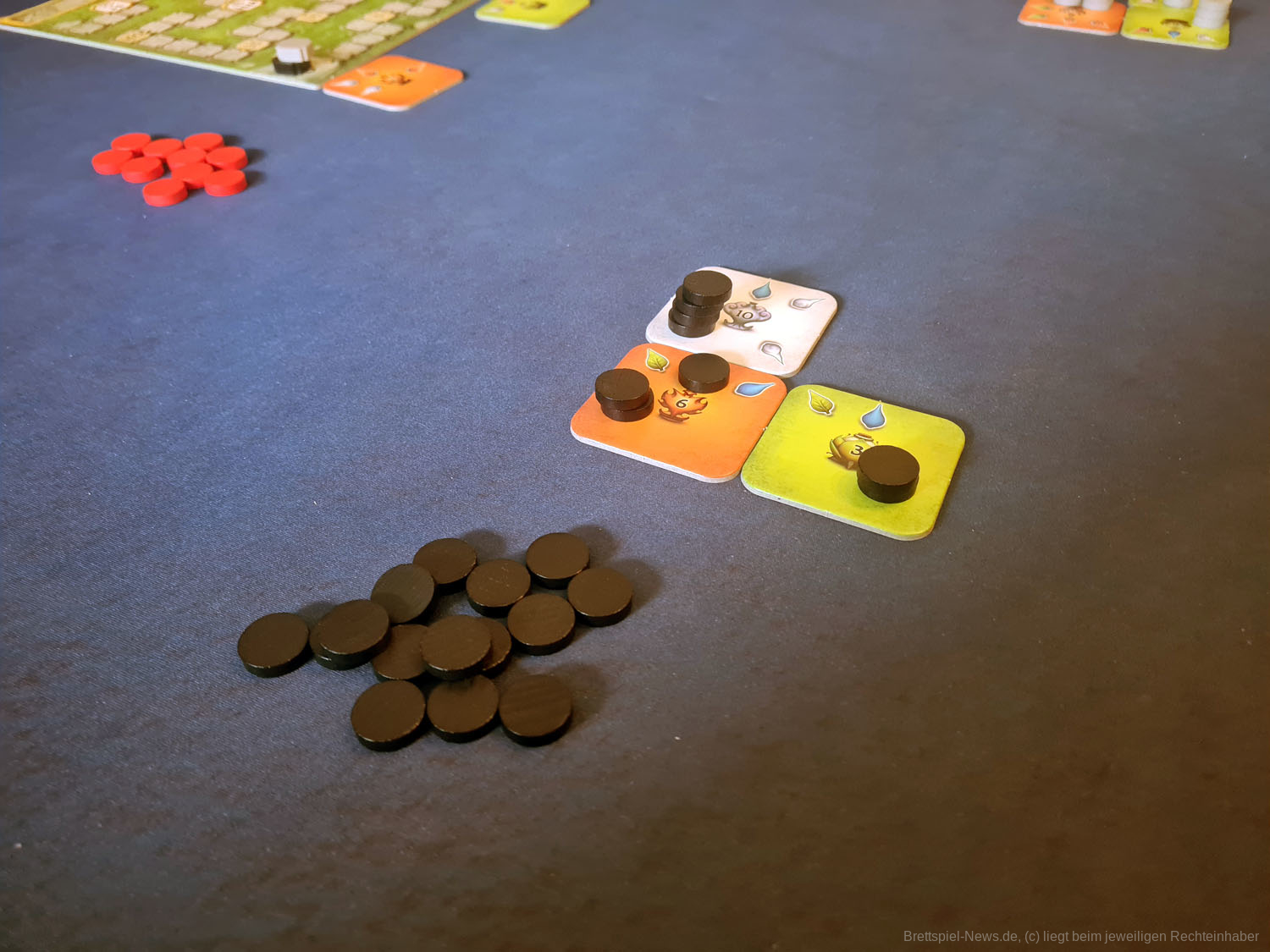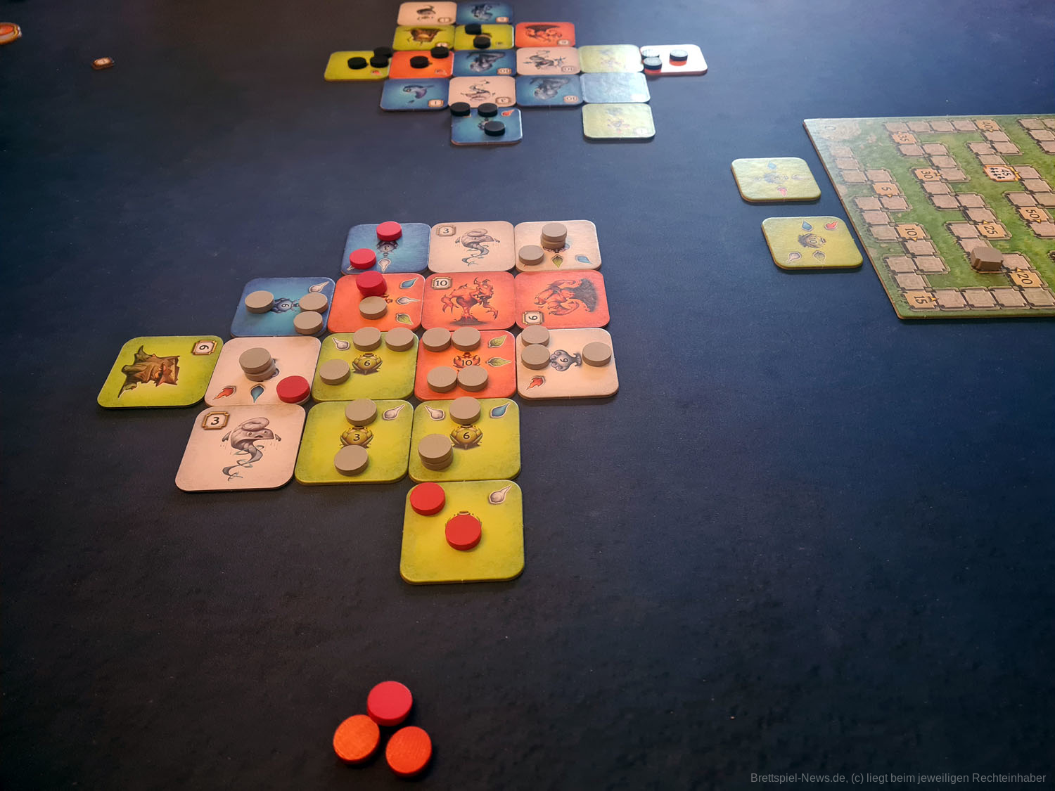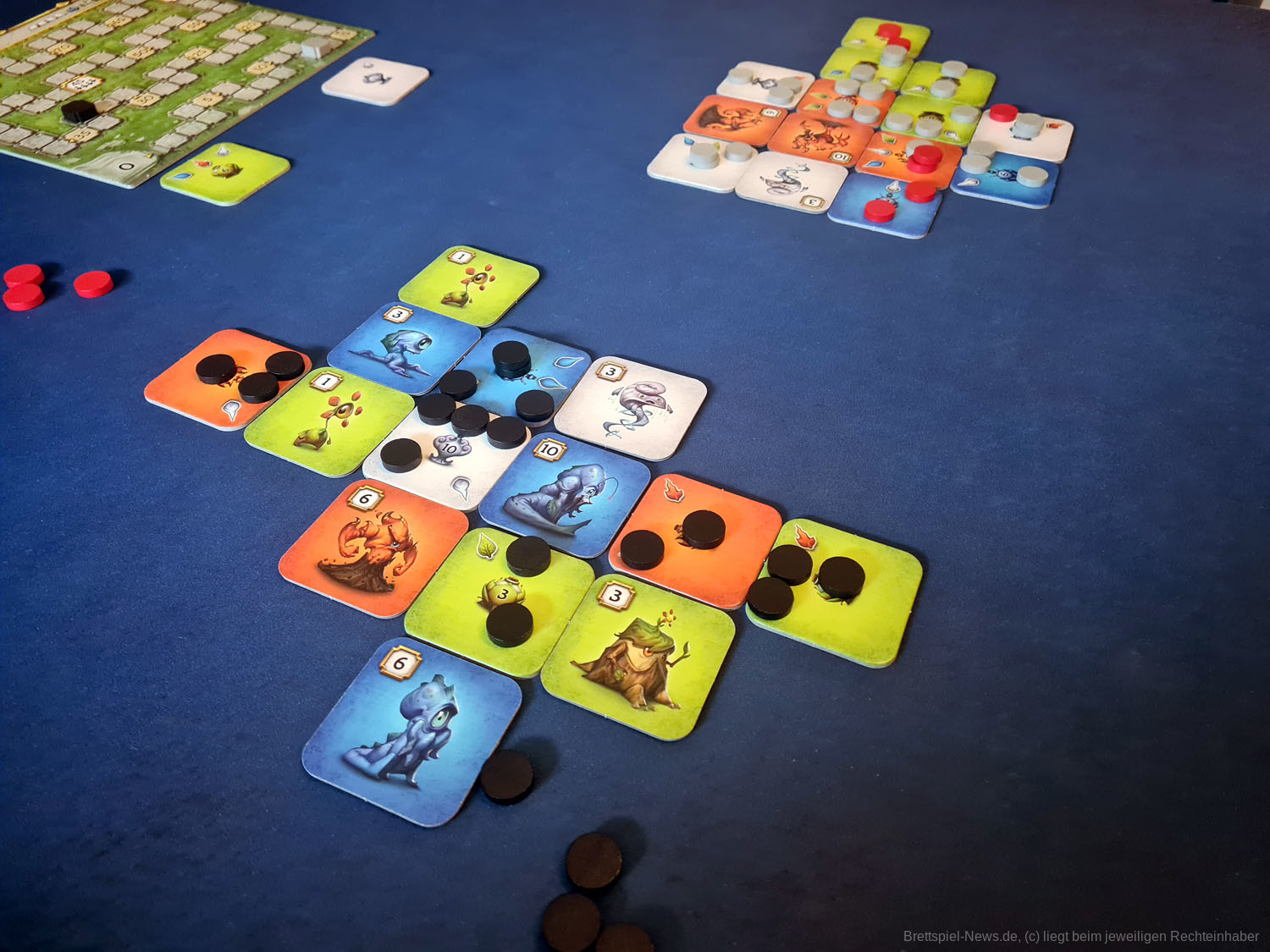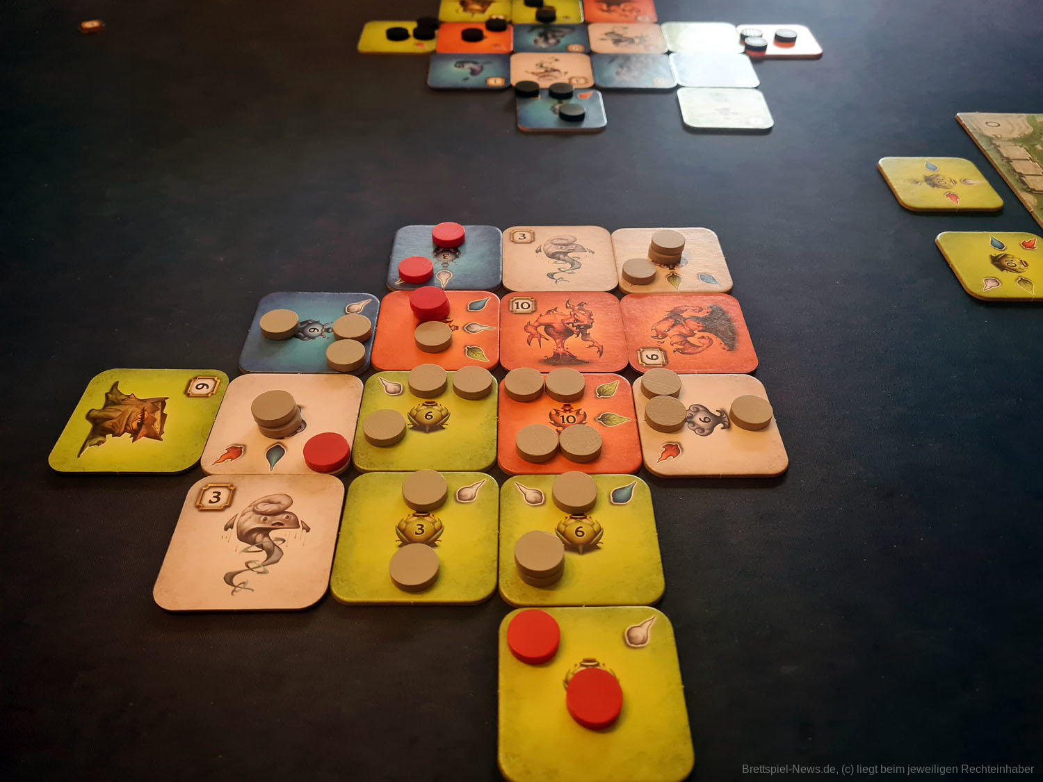 Wie bereits erwähnt wurde, müssen 1 bis 4 Spielende die Plättchen der Naturgeister so geschickt aneinanderlegen, dass ihre Voraussetzungen erfüllt werden, um sich zu entfalten. Die Plättchen der Naturgeister besitzen eine Vorder- und eine Rückseite, die alle nötigen Informationen bereithalten. Auf der Rückseite der Plättchen befindet sich ein kleines Bild des jeweiligen Naturgeistes mit dessen festgeschriebener Siegpunktzahl. Diese Siegpunkte erhalten die Spielenden, sobald sie die Voraussetzungen des Naturgeistes erfüllt haben. Diese Voraussetzungen befinden sich auf der Vorderseite des Plättchens in Form von kleinen farbigen Pfeilen. Jede Farbe passt zu einer Naturgeistart: grün für Wald, rot für Feuer, blau für Wasser und weiß für Wind. Je höher die Punktzahl des Naturgeistes ist (1,3,6 oder 10 Punkte) desto mehr Pfeile befinden sich auf dem Plättchen. Die Anzahl der Pfeile ist allerdings immer gleich, sodass die Spielenden zum Beispiel immer wissen, dass ein Plättchen für 10 Siegpunkte 4 Pfeile besitzt (was später wichtig wird).