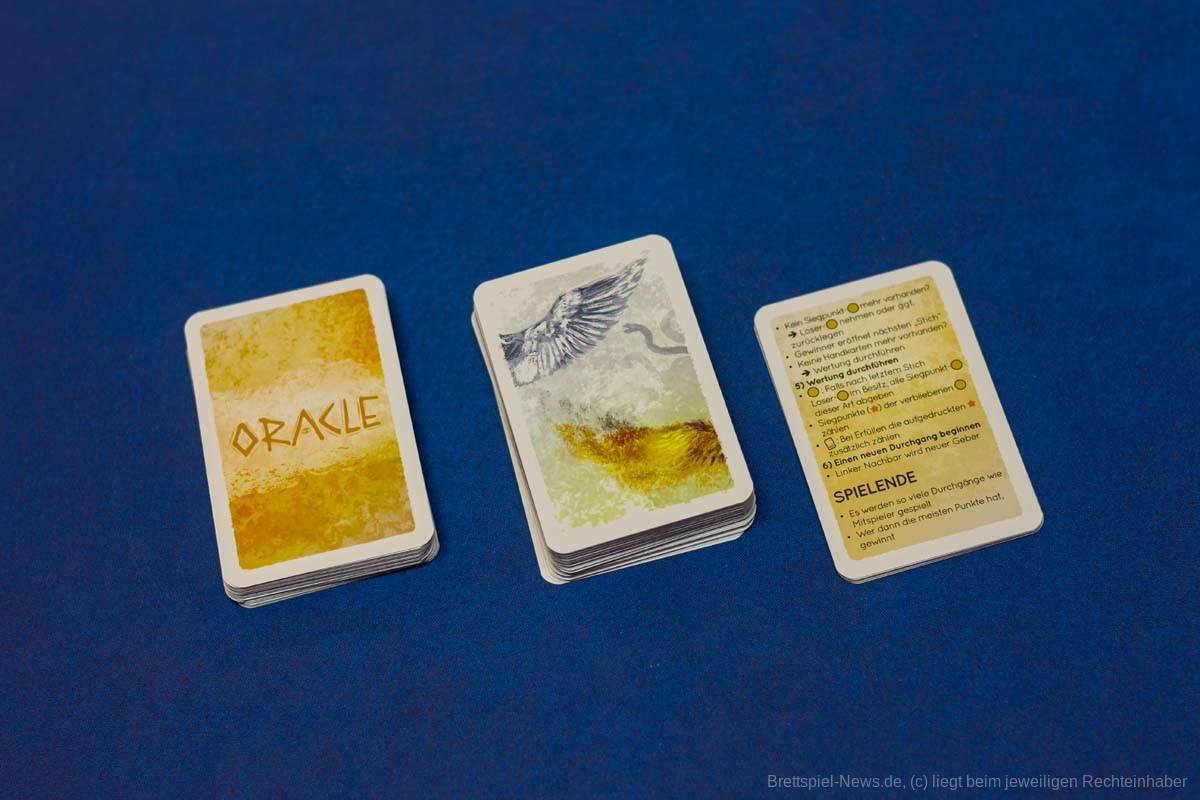 ORACLE bietet Neulingen und Veteranen des Genres gleichermaßen ein schönes, schnelles und besonders flüssiges Stich-Spiel. Durch seinen hohen Wiederspielwert und die große Vielzahl an unterschiedlichen Missionen kann ORACLE einen ganzen Abend füllen oder durch sein schnelles und flüssiges Spielgeschehen als Spiel für zwischendurch dienen.