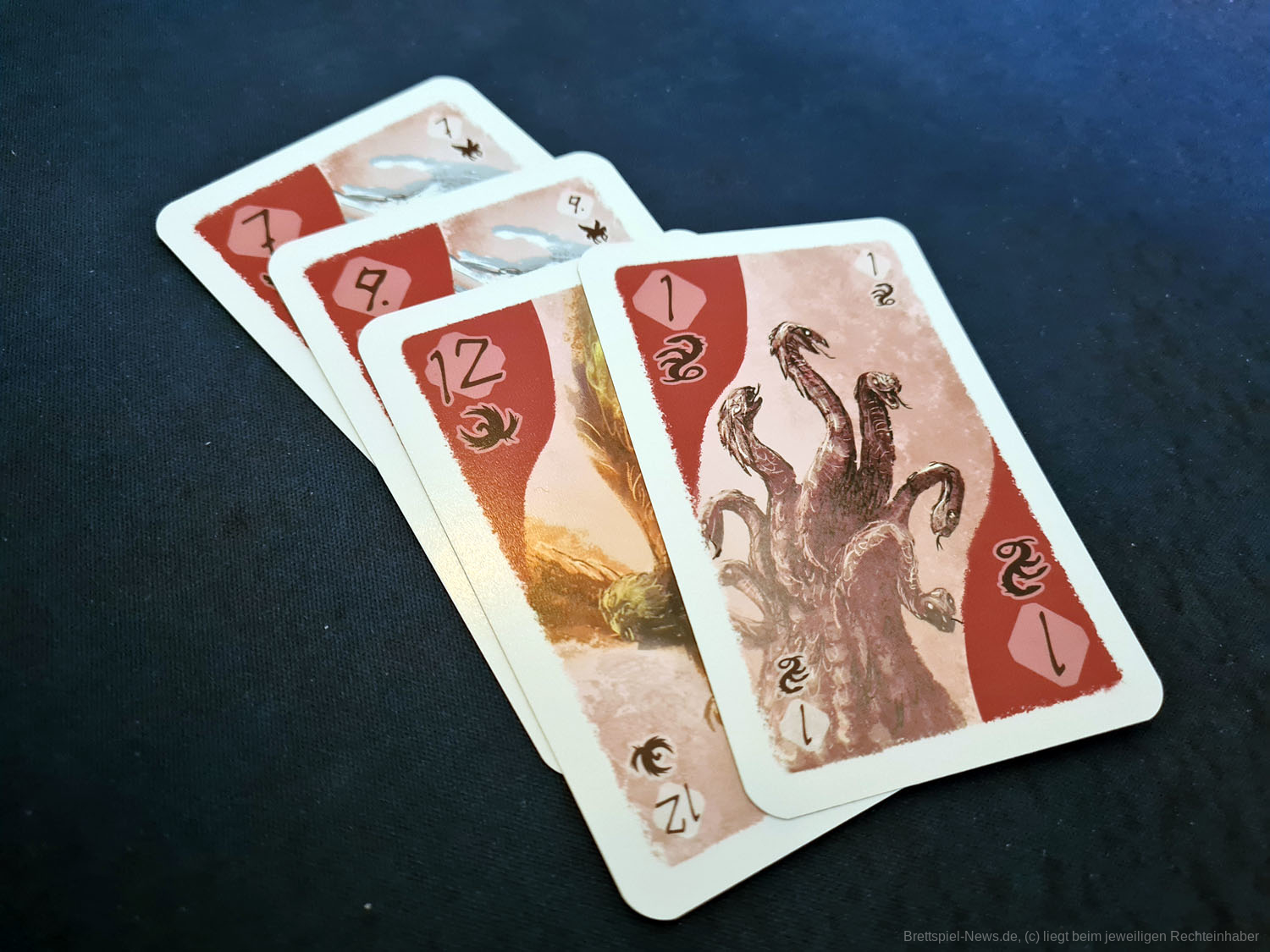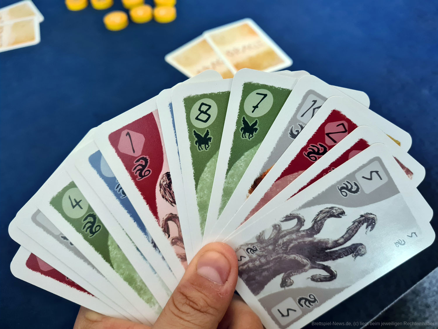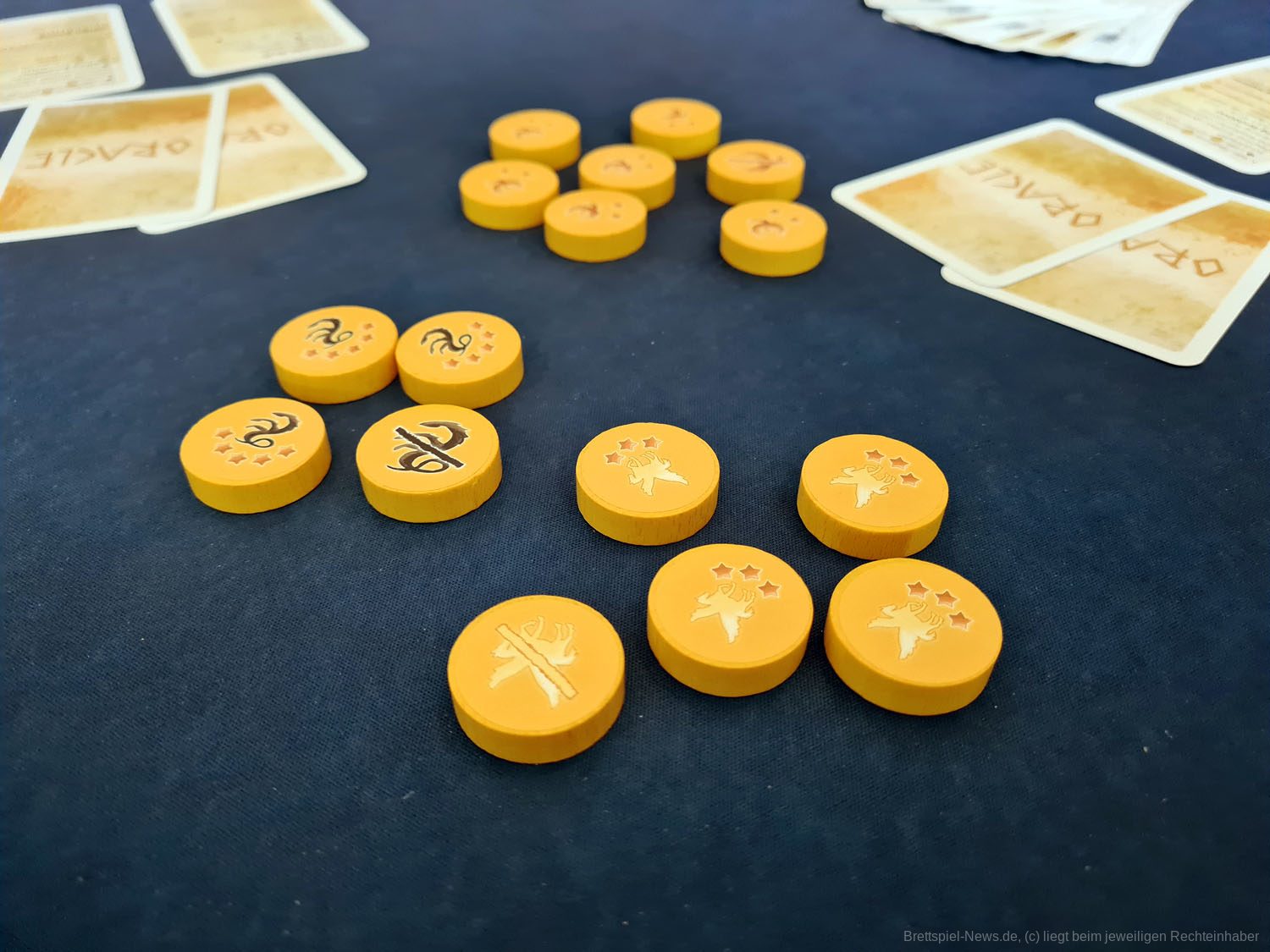 Bereits beim Testen des Prototyps war ich positiv von ORACLE überrascht. Wer meine Rezension zu DIE CREW oder ANANSI gelesen hat, wird wissen, dass mein persönlicher Geschmack in Bezug auf Stich-Spiele „besonders“ ist. ORACLE scheint diesen aber genau zu treffen. Jeder Spielende kann in ORACLE bereits zu Beginn eine kleine Strategie bereitlegen, um bestmöglich die eigenen Missionen zu erfüllen, wobei auch im Spiel die Herausforderung besteht, nicht über das Ziel hinaus zu schießen. ORACLE gelingt es von Anfang bis Ende eine gewisse Spannung aufzubauen, ob die geplante Strategie aufgeht oder ob der Zufall zu sehr eingreift und alles zunichtemacht. Insbesondere die 40 unterschiedlichen Orakel-Karten, die jeweils eine einzigartige Mission beinhalten, haben mir äußerst gut gefallen, da sie in jeder Runde die Spielenden dazu bringen, nicht immer die gleiche Erfolgsstrategie zu verfolgen und dadurch auch der Wiederspielwert enorm erhöht wird.