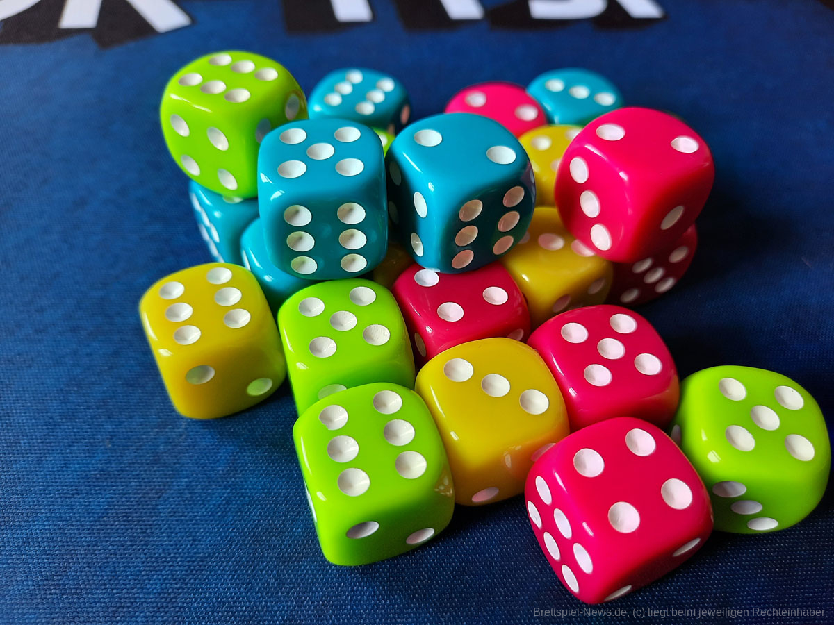 Allein wegen der 24 Würfel in dem Spiel würden sich die 14,99€ schon lohnen, wenn es jemand nur darauf abgesehen haben sollte. Die Plättchen sind aus dicker Pappe und der Gummihaufen quietscht, wie er es soll.
