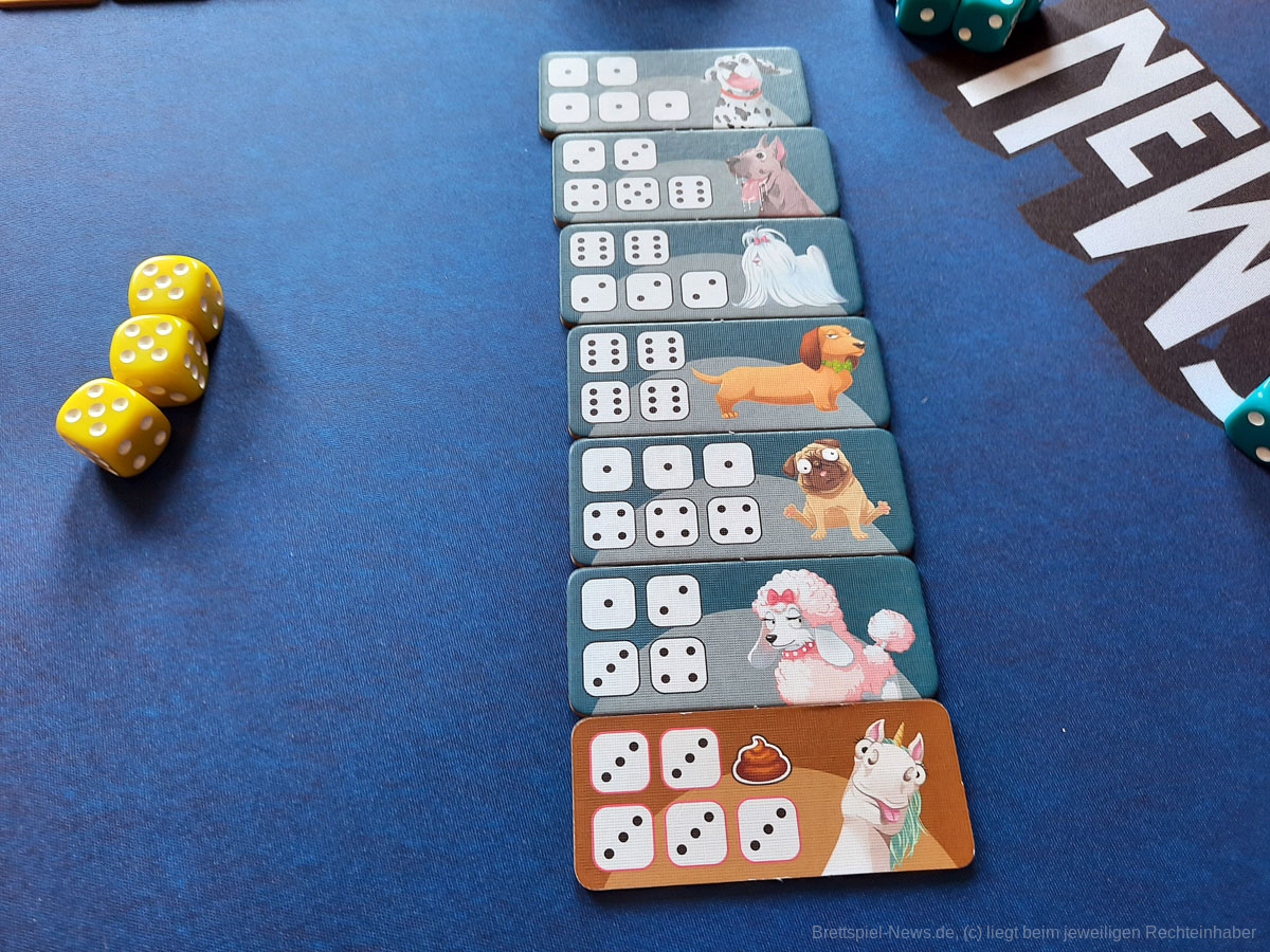 Bei vorangeschrittenem Spiel liegen irgendwann die braunen Plättchen oben und können weggewürfelt werden. Diese wechseln aber nicht die Person, sondern kommen in die „Poo Poo Box“, also aus dem Spiel. Liegen keine Plättchen mehr vor dir, „scheidest du aus“. Haha! Wer als letztes noch Tierplättchen hat, gewinnt das Spiel.