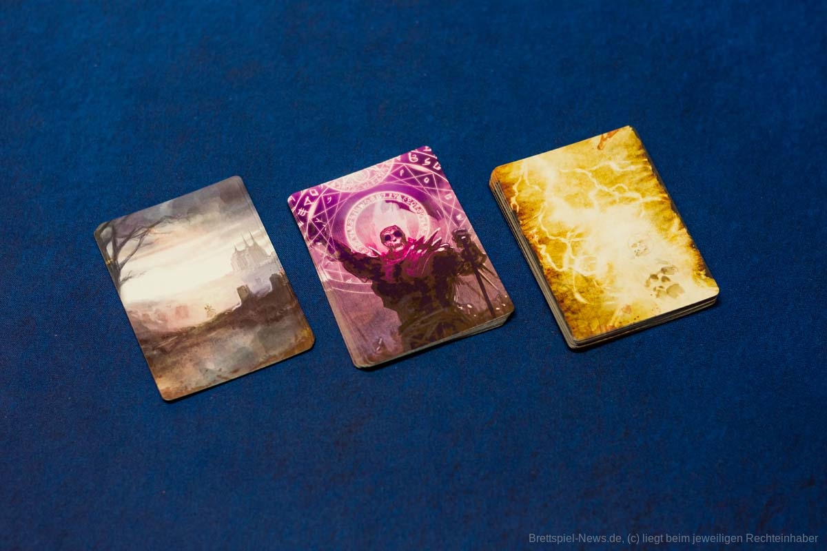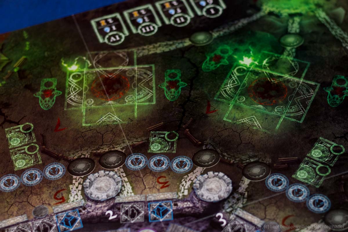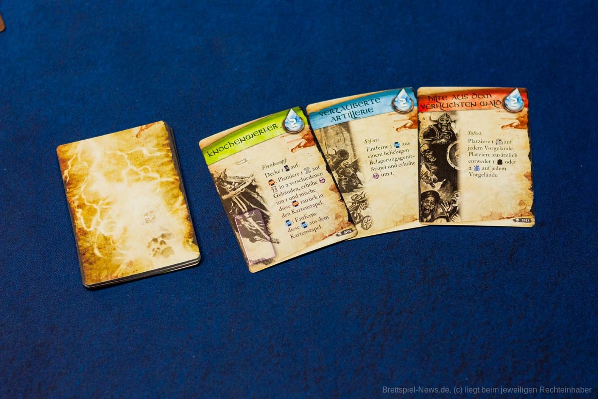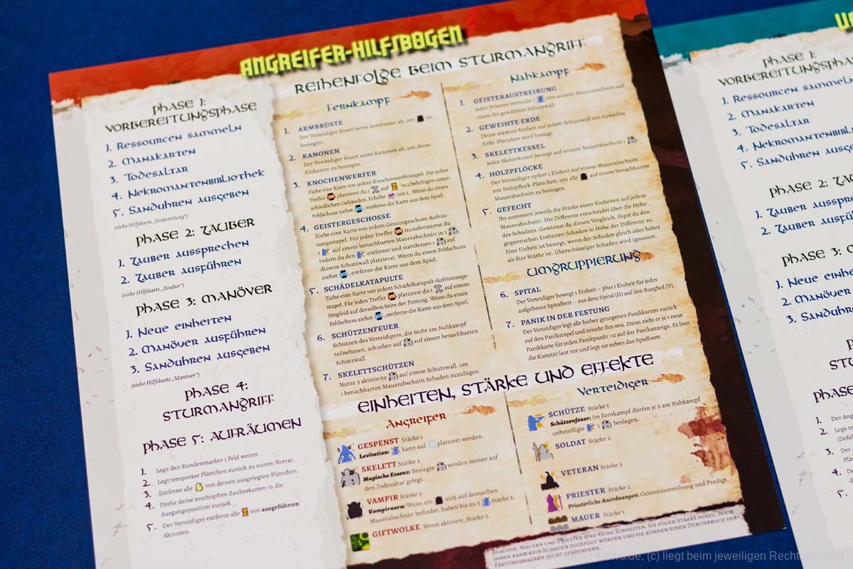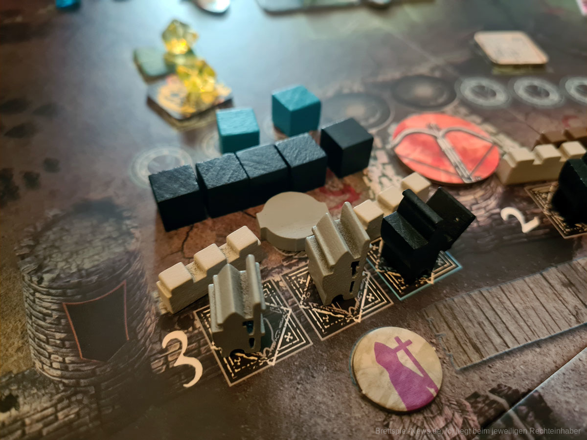Ein wenig befremdlich empfanden wir, dass die Retail-Version des Spiels an fast allen Ecken und Enden beschreibt, wo denn in der Kickstarter-Version etwas anders wäre. So wirkten beispielsweise die unterschiedlichen Truppen ein wenig komisch: Während die Burg mit coolen individuellen Meeplen verteidigt wird, befehligt die andere Seite eine Armee aus gesichtslosen farbigen Blöcken. Dadurch verstärkt sich der Verdacht, dass in Zukunft Erweiterungspacks angeboten werden könnten, welche die Armee der Untoten auch mit Meeplen versorgen, wie dies in der Kickstarterversion bereits der Fall war.