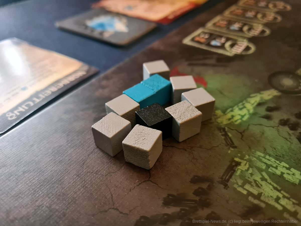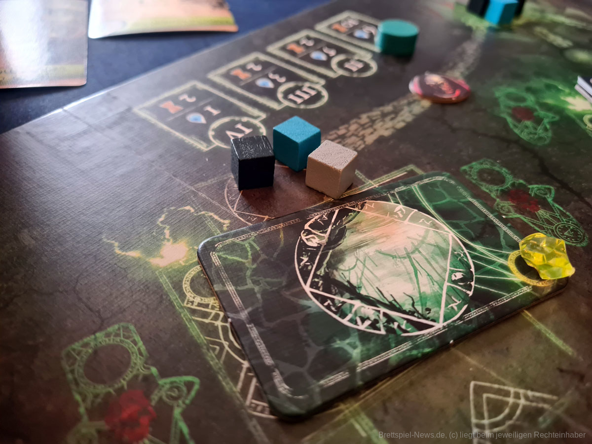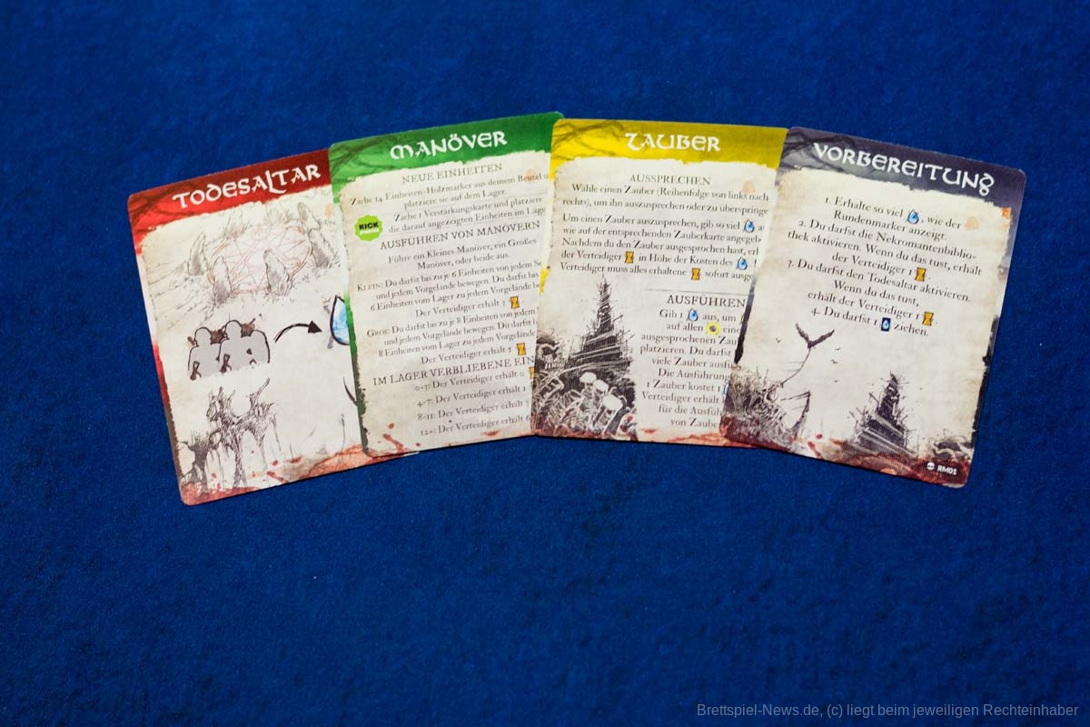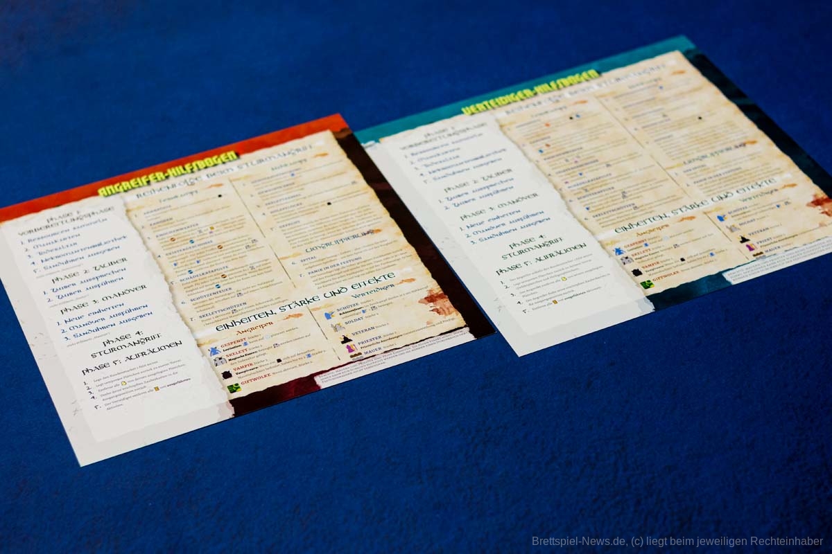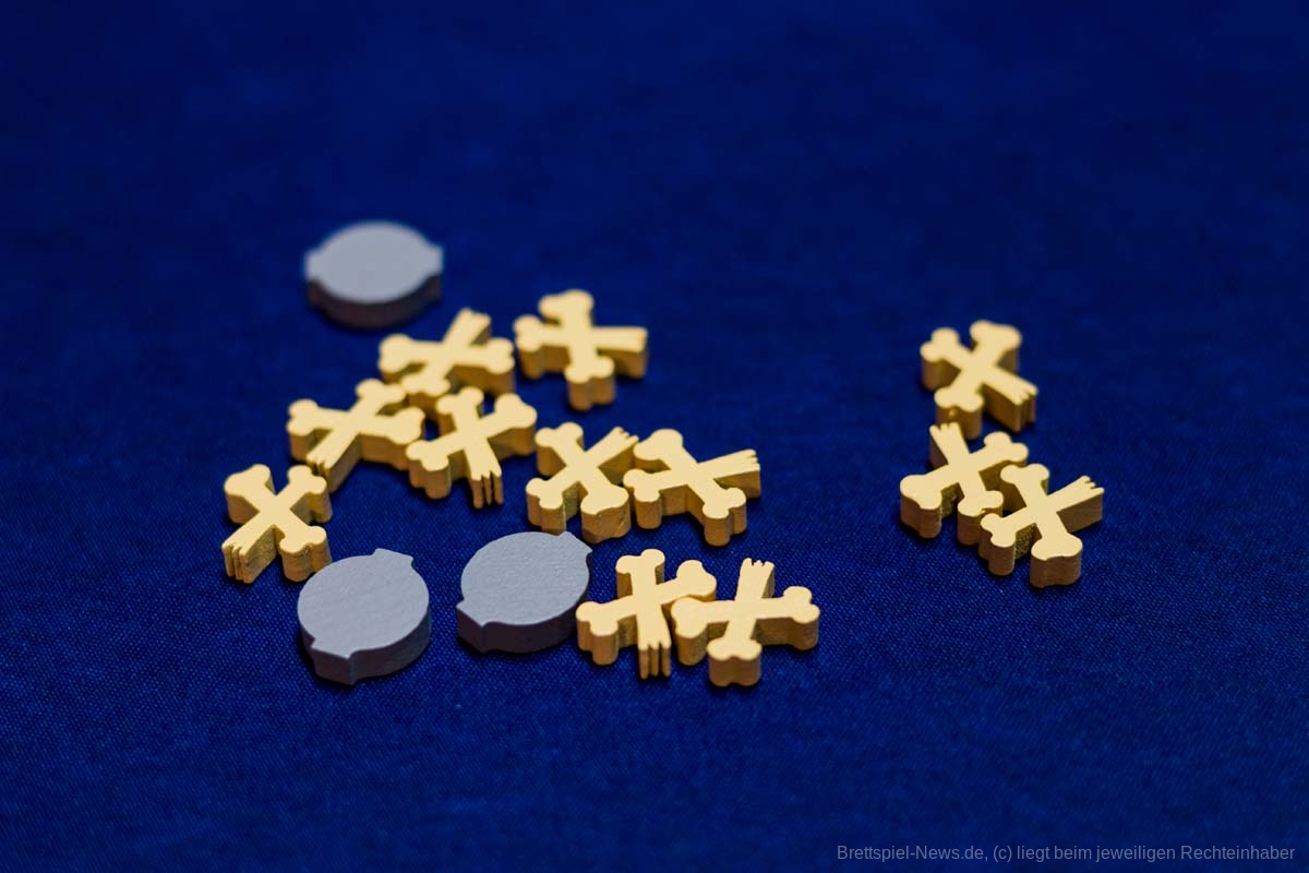 Ein wenig befremdlich empfanden wir, dass die Retail-Version des Spiels an fast allen Ecken und Enden beschreibt, wo denn in der Kickstarter-Version etwas anders wäre. So wirkten beispielsweise die unterschiedlichen Truppen ein wenig komisch: Während die Burg mit coolen individuellen Meeplen verteidigt wird, befehligt die andere Seite eine Armee aus gesichtslosen farbigen Blöcken. Dadurch verstärkt sich der Verdacht, dass in Zukunft Erweiterungspacks angeboten werden könnten, welche die Armee der Untoten auch mit Meeplen versorgen, wie dies in der Kickstarterversion bereits der Fall war.