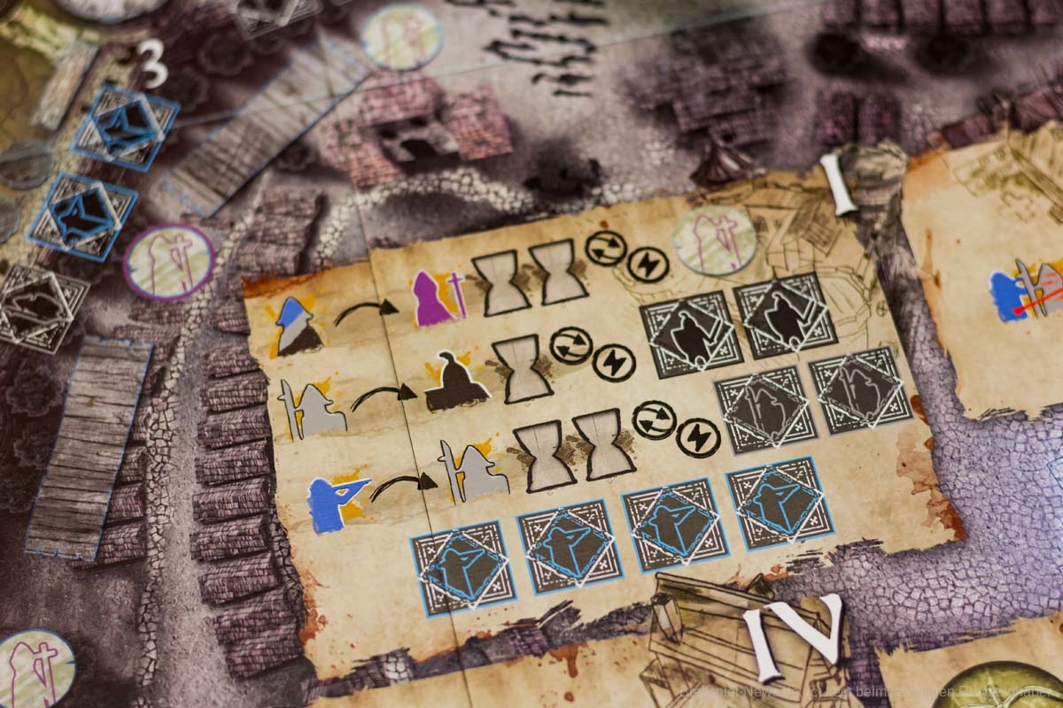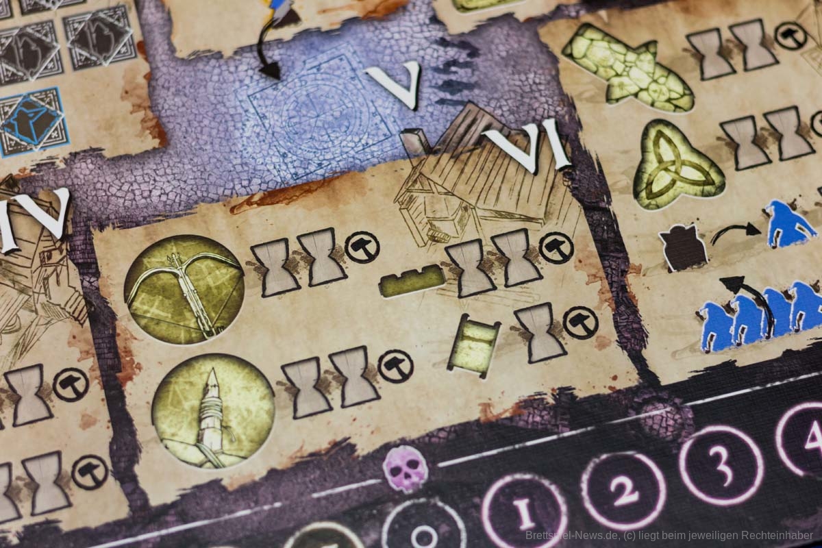 Dabei klingt das alles viel schlimmer als es eigentlich ist. STRONGHOLD UNDEAD erfüllt seine eigene Prämisse nämlich wirklich gut. Das Spiel an sich ist äußerst thematisch, sodass sich viele Spielbereiche fast wie von selbst erklären und alle Mechaniken Verbindungen zum Thema ziehen können. Das Zeitsystem ist da besonders hervorzuheben, da es sich sehr gut in die Thematik und die grundlegenden Spielmechaniken einfügt. Die angreifenden Spielenden müssen so mehrfach überlegen, welche Aktionen wie genau durchgeführt werden müssen, ohne der Burg zu viele Handlungsoptionen zu geben. Hier liegt auch die große Komplexität des Spiels, da es immer gilt, so viel Zerstörung wie möglich mit so wenig Aktionen wie nötig anzurichten.