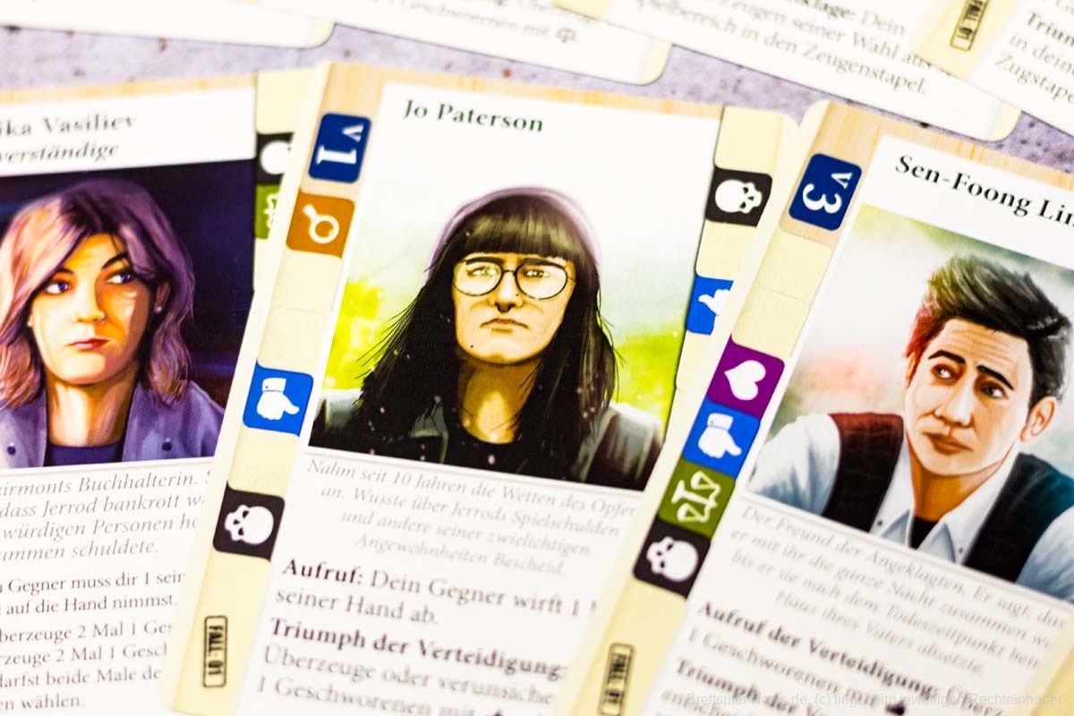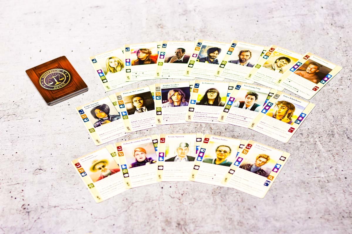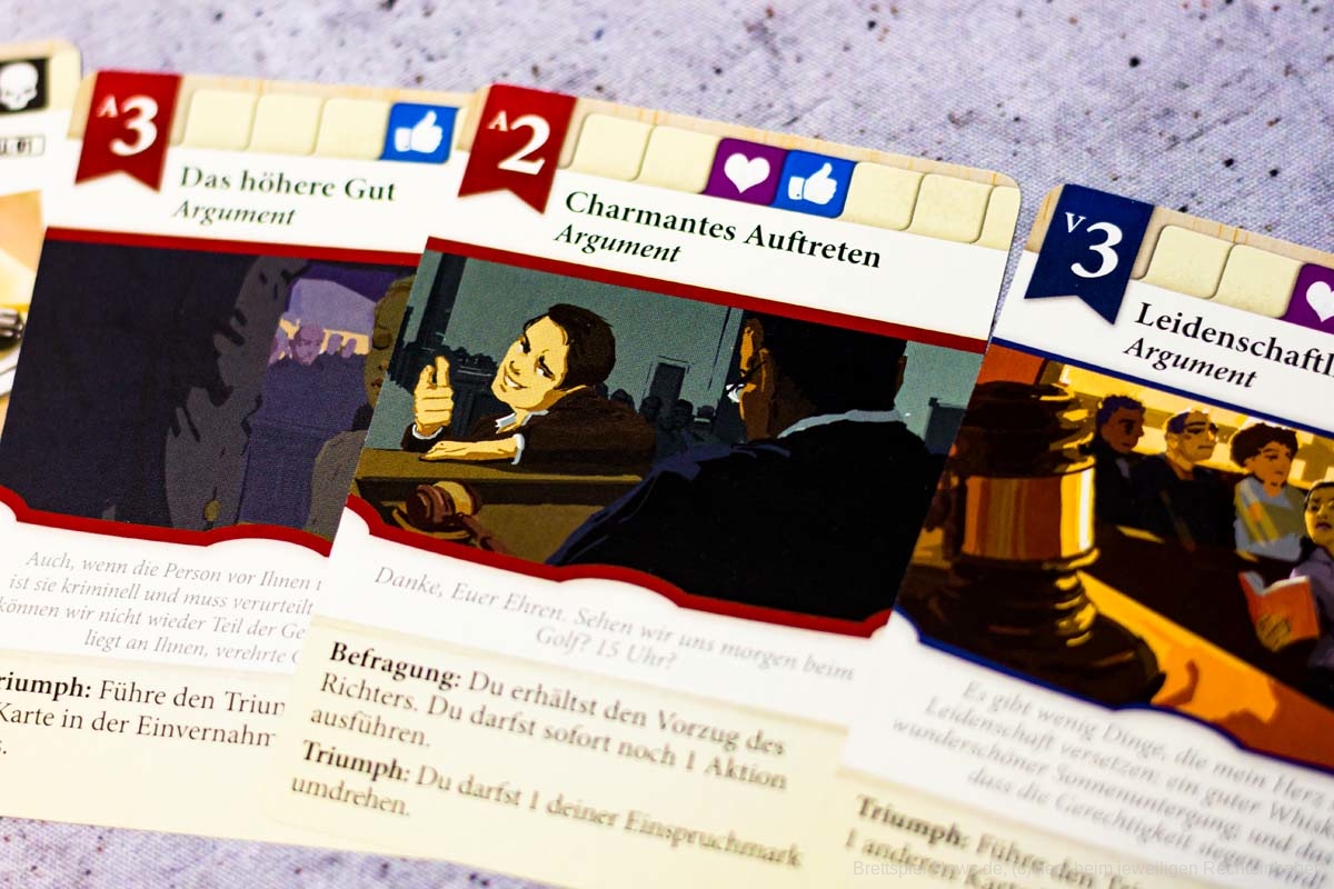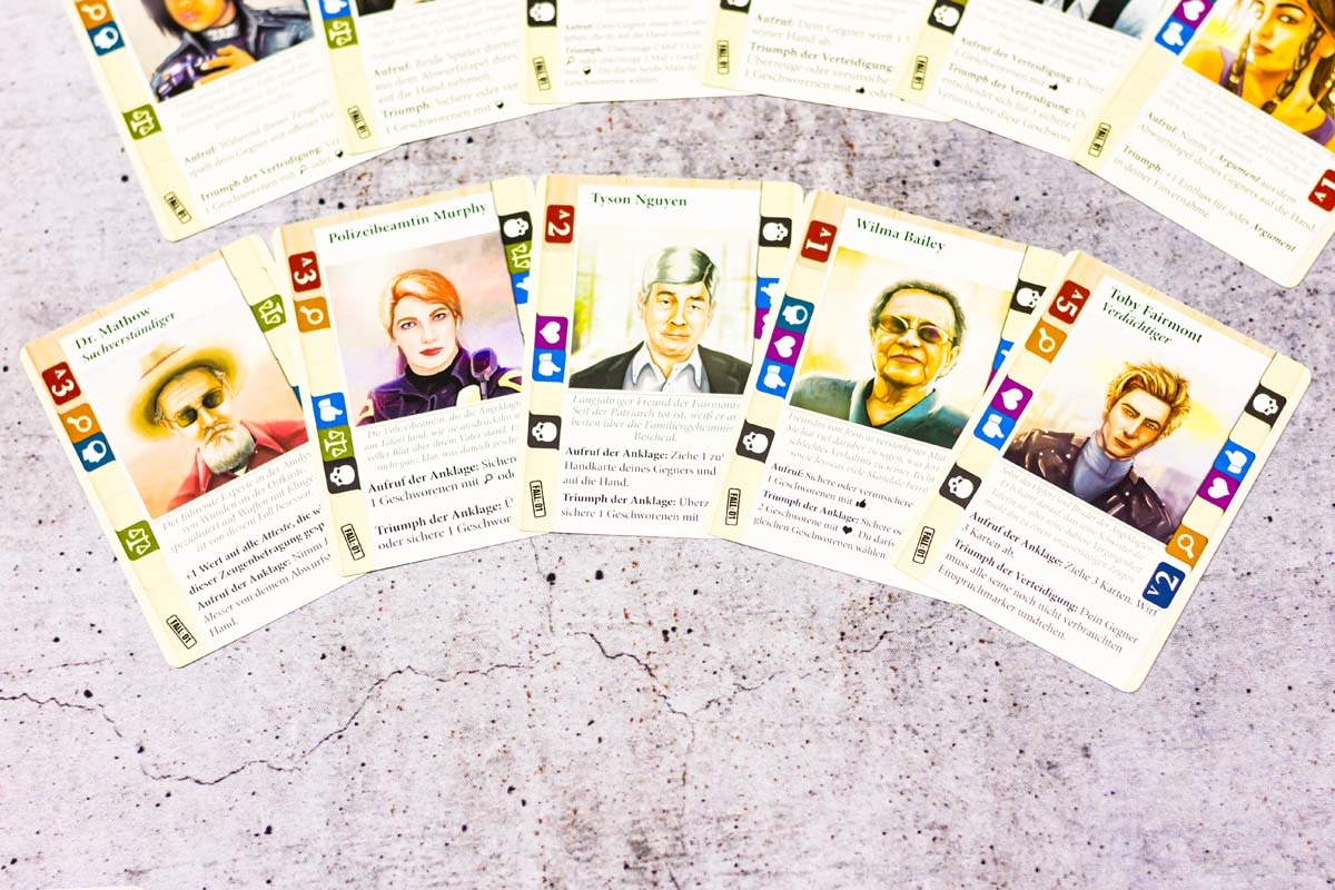 Das Spiel enthält zwar einige taktische Aspekte, großer Tiefgang und Spielspaß stellt sich jedoch nicht ein. Letzteres liegt unserer Meinung vor allem an der repetitiven Mechanik, die das Thema in den Hintergrund drängt. Die Flavourtexte laut vorzulesen kam uns bereits nach der ersten Runde sehr aufgesetzt vor. Im Mittelpunkt stehen die Symbole, Stimmungstext, Illustrationen und sogar das Thema sind im Endeffekt nur unwichtiges Beiwerk. Das abwechselnde Ausspielen und Abpassen der eigenen Karten auf die des Gegners und auch das Tauziehen um die Gunst der Geschworenen sind die einzigen Aspekte, die das Setting eines Gerichtsprozess erahnen lassen. Ein nachvollziehbarer Ablauf des Prozesses findet nicht statt, auch weil sehr viele Beweisstücke usw. in einer Partie nicht vorkommen. Wäre es also ein fiktiver Fall gewesen, hätte das auch niemanden am Tisch gestört. Hat man mit all dem kein Problem, bietet das Spiel einiges an Wiederspielwert. Verschiedene Richter, Strategiekarten und Spielmodi sorgen für wechselnde Bedingungen.