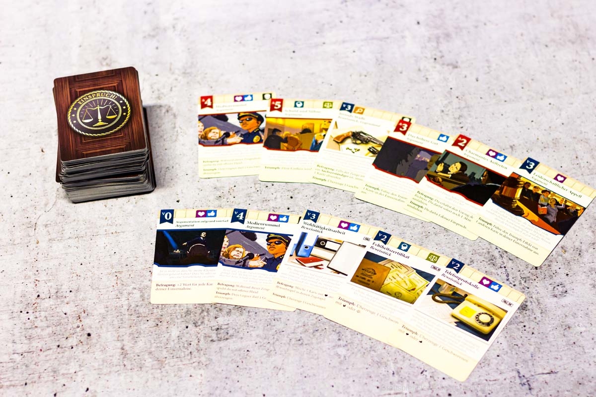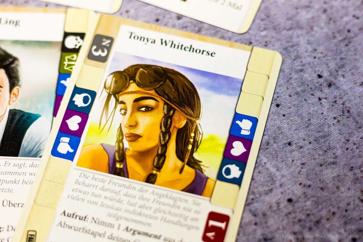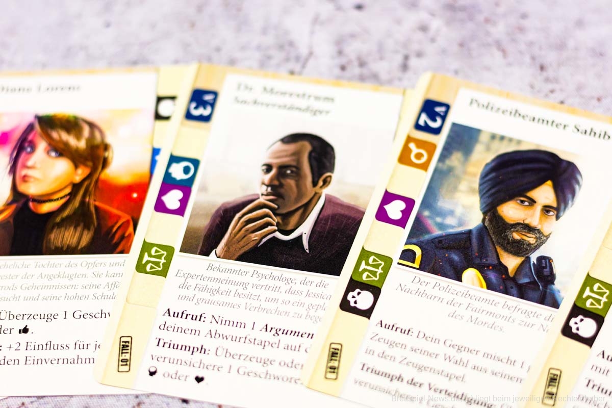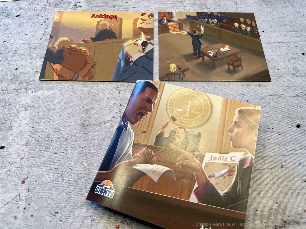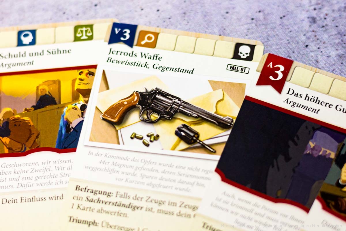 Das Spiel enthält zwar einige taktische Aspekte, großer Tiefgang und Spielspaß stellt sich jedoch nicht ein. Letzteres liegt unserer Meinung vor allem an der repetitiven Mechanik, die das Thema in den Hintergrund drängt. Die Flavourtexte laut vorzulesen kam uns bereits nach der ersten Runde sehr aufgesetzt vor. Im Mittelpunkt stehen die Symbole, Stimmungstext, Illustrationen und sogar das Thema sind im Endeffekt nur unwichtiges Beiwerk. Das abwechselnde Ausspielen und Abpassen der eigenen Karten auf die des Gegners und auch das Tauziehen um die Gunst der Geschworenen sind die einzigen Aspekte, die das Setting eines Gerichtsprozess erahnen lassen. Ein nachvollziehbarer Ablauf des Prozesses findet nicht statt, auch weil sehr viele Beweisstücke usw. in einer Partie nicht vorkommen. Wäre es also ein fiktiver Fall gewesen, hätte das auch niemanden am Tisch gestört. Hat man mit all dem kein Problem, bietet das Spiel einiges an Wiederspielwert. Verschiedene Richter, Strategiekarten und Spielmodi sorgen für wechselnde Bedingungen.