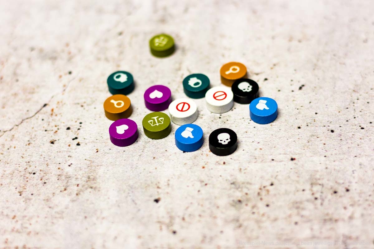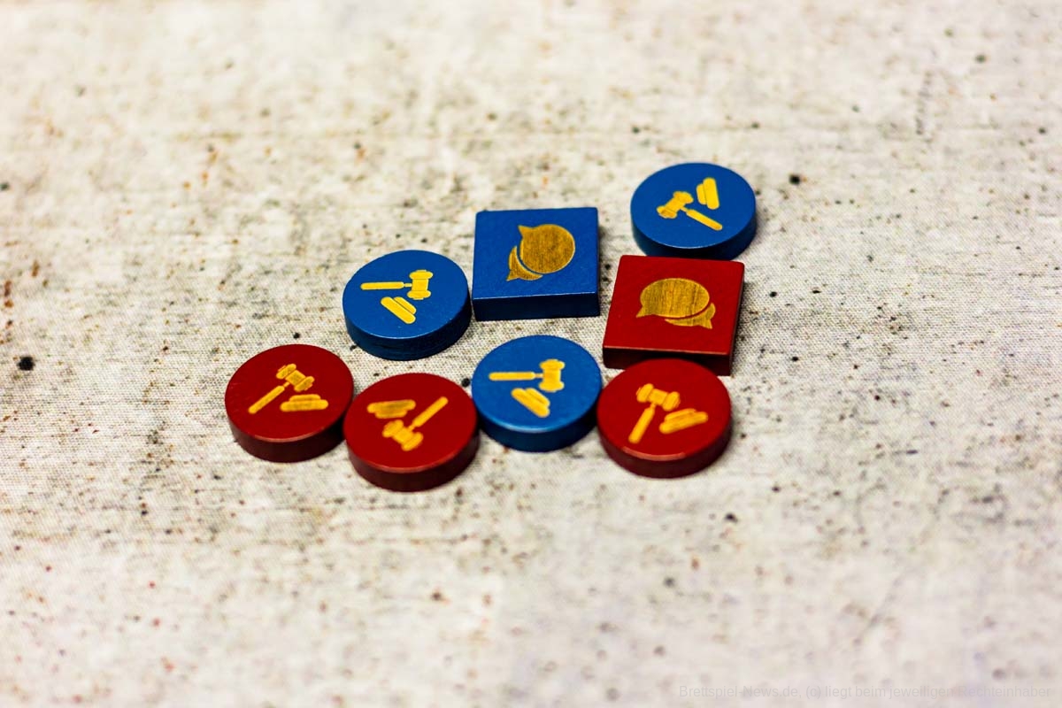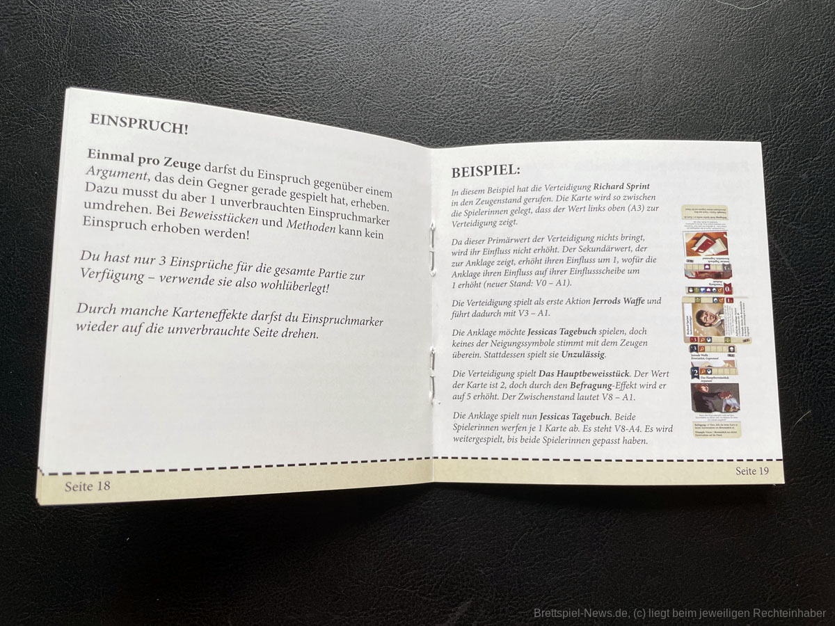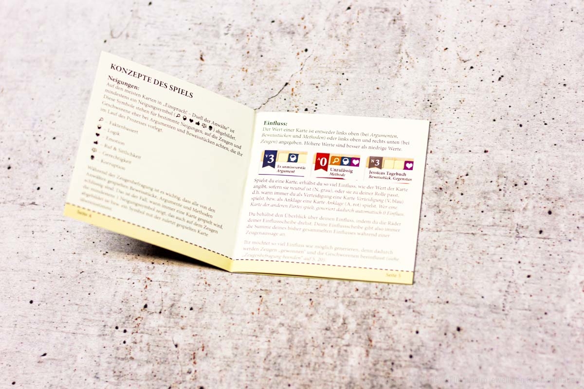 Das Spiel enthält zwar einige taktische Aspekte, großer Tiefgang und Spielspaß stellt sich jedoch nicht ein. Letzteres liegt unserer Meinung vor allem an der repetitiven Mechanik, die das Thema in den Hintergrund drängt. Die Flavourtexte laut vorzulesen kam uns bereits nach der ersten Runde sehr aufgesetzt vor. Im Mittelpunkt stehen die Symbole, Stimmungstext, Illustrationen und sogar das Thema sind im Endeffekt nur unwichtiges Beiwerk. Das abwechselnde Ausspielen und Abpassen der eigenen Karten auf die des Gegners und auch das Tauziehen um die Gunst der Geschworenen sind die einzigen Aspekte, die das Setting eines Gerichtsprozess erahnen lassen. Ein nachvollziehbarer Ablauf des Prozesses findet nicht statt, auch weil sehr viele Beweisstücke usw. in einer Partie nicht vorkommen. Wäre es also ein fiktiver Fall gewesen, hätte das auch niemanden am Tisch gestört. Hat man mit all dem kein Problem, bietet das Spiel einiges an Wiederspielwert. Verschiedene Richter, Strategiekarten und Spielmodi sorgen für wechselnde Bedingungen.