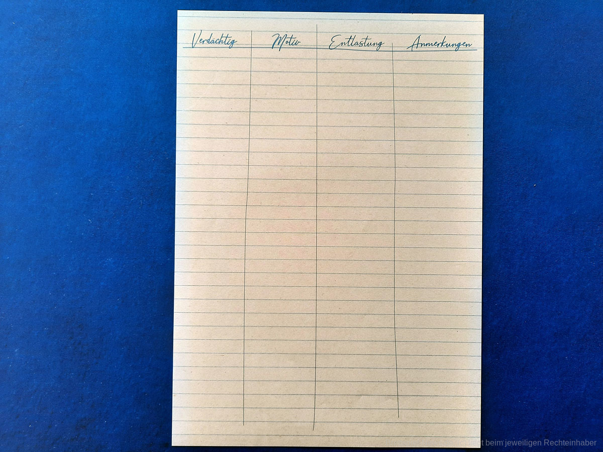 Hierzu gibt es eine Menge Dokumente, die gesichtet werden müssen. Dabei kommen verschiedene Medien zum Einsatz, also haltet eure Smartphones bereit. Auf einem Poster sind verschiedene Personen abgebildet, zu denen im Spielverlauf Stichpunkte notiert werden. Außerdem gibt es eine Liste mit vier Spalten — verdächtig, Motiv, Entlastung und Anmerkung —, die nach und nach gefüllt wird. So werden die Informationen analysiert, Motive und Verbindungen zwischen den Personen aufgedeckt, um am Ende die Fragen zu beantworten und somit den Fall zu lösen.