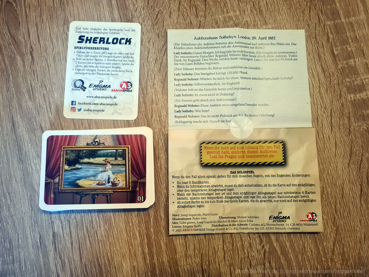 Alle Teile der SHERLOCK-Reihe enthalten einen Kartenstapel mit Illustrationen, die von Tagebucheinträgen bis hin zu Zeichnungen des Tatortes oder gezeichneten Fotografien reichen. Qualitativ sind die Karten und Illustrationen von guter Qualität, sodass sie ihrem Nutzen vollkommen gerecht werden. Besonders die Größe der Karten könnte für Spielende mit Augenproblemen aber zum Problem werden, da einige Karten verlangen, dass sie ganz genau betrachtet werden müssen und die jeweiligen Hinweise sehr klein sind.