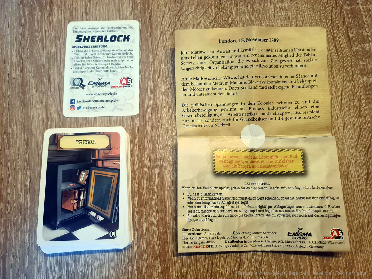 Das enthaltene Regelheft, welches auch die Komplettlösung des Falls und den Fragebogen enthält erfüllt seinen Zweck sehr gut, sodass Spielende mit unterschiedlichsten Erfahrungsstand direkt ins Spiel einteigen können, ohne sich lange mit den Regeln aufhalten zu müssen.
