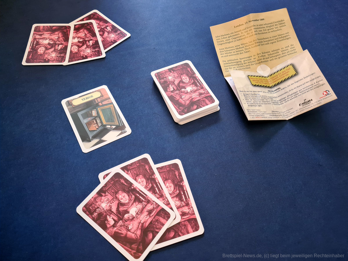 Ganz ähnlich verlief es auch im dritten Teil der Reihe ( SÉANCE MIT EINEM TOTEN), den ich mit meiner besseren Hälfte spielte. Auch hier lösten wir den Fall (diesmal sogar besser als beim ersten Teil), jedoch warfen wir auch hier die wichtigsten Hinweise aus Unwissenheit ab. Insbesondere gab es hier enorme Probleme, da der gesamte Fall eigentlich kaum gelöst werden kann, wenn die Verbindungen von genau 2 Karten nicht erkannt werden. Das führe ich weniger auf die erhöhte Schwierigkeit des Titels zurück, sondern vielmehr auf einen noch stärker erhöhten Glücksfaktor. Zusätzlich legt dieser Teil (ob beabsichtigt oder unbeabsichtigt ist kaum zu sagen) eine größere falsche Fährte, die nicht genug in den Hinweisen analysiert wird und damit zu einer groben Fehlentscheidung führen kann (Aus diesem Grund betrachte ich diesen Teil auch als den Schwächsten der 3 von mir getesteten Teile).