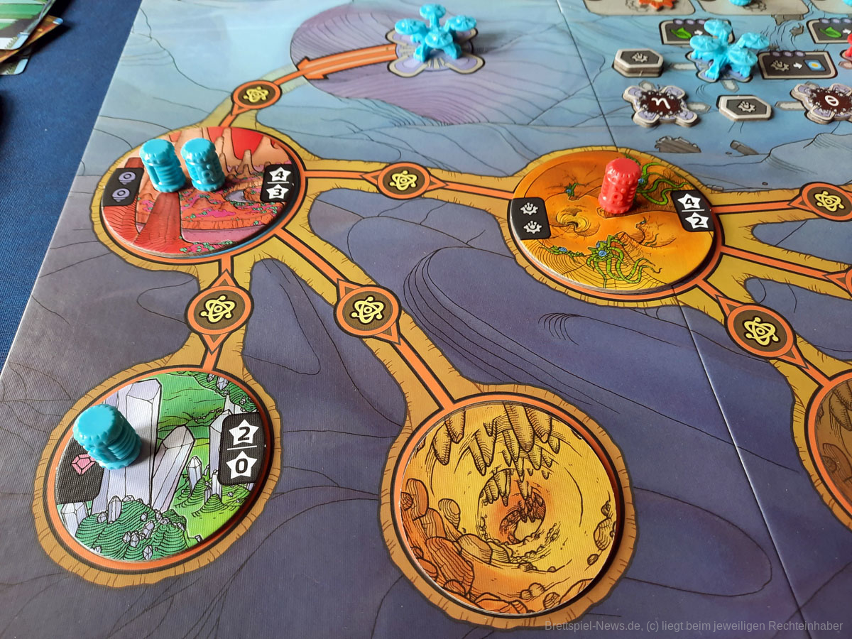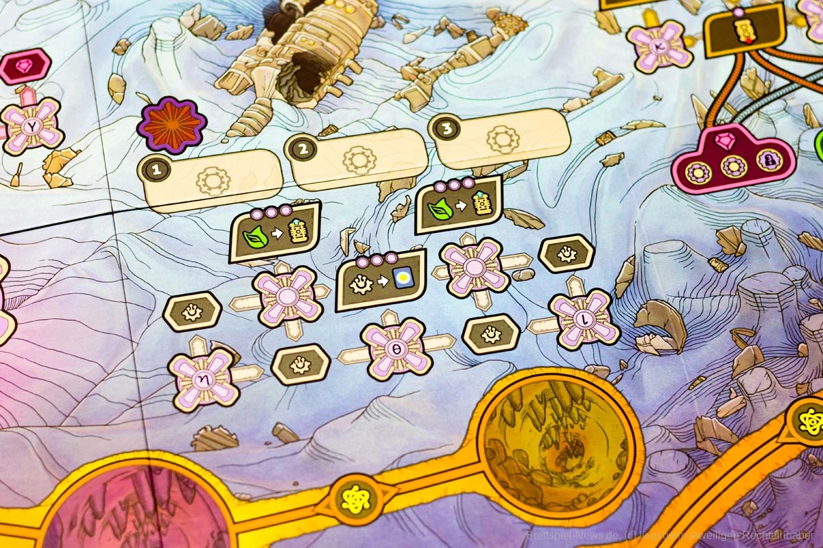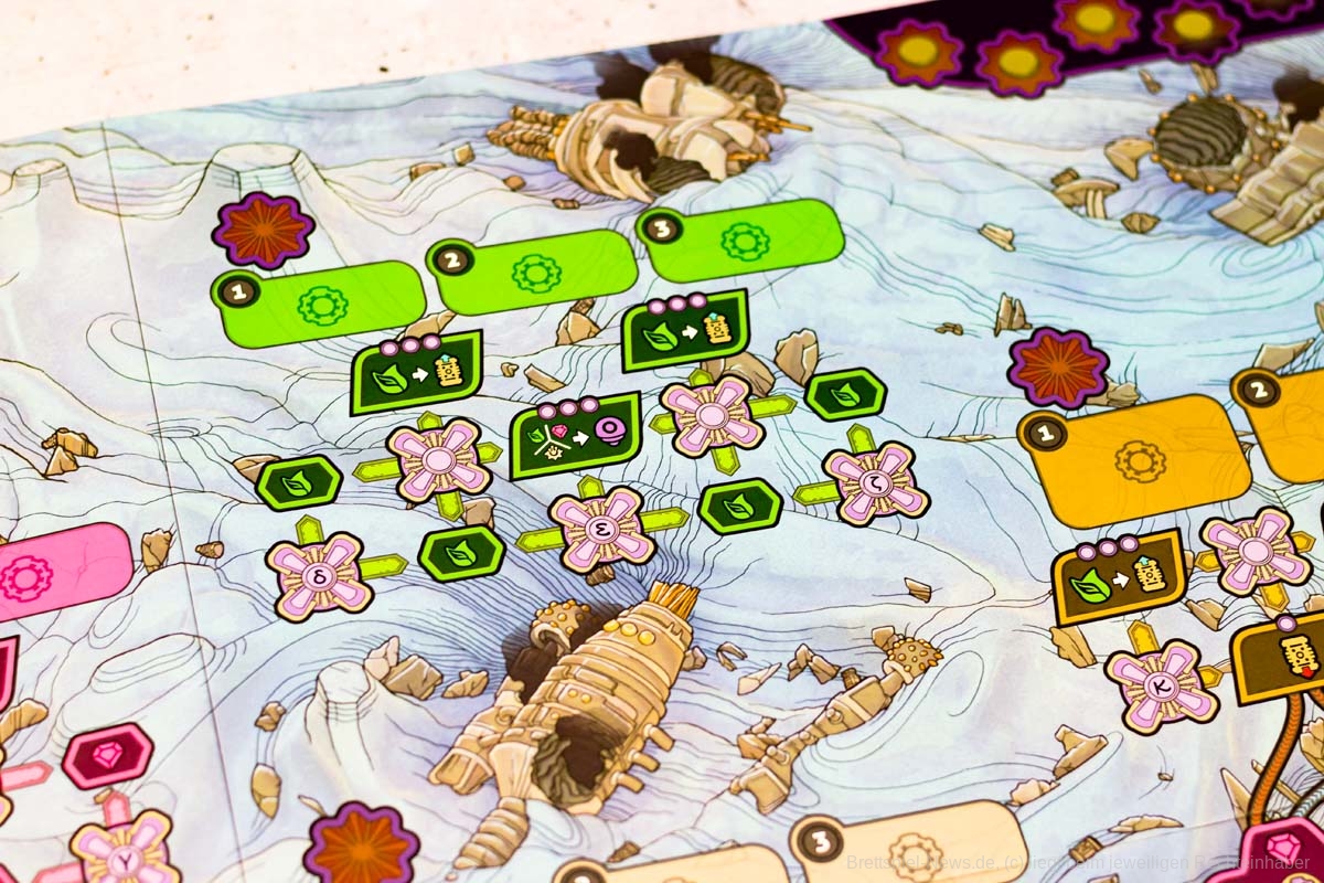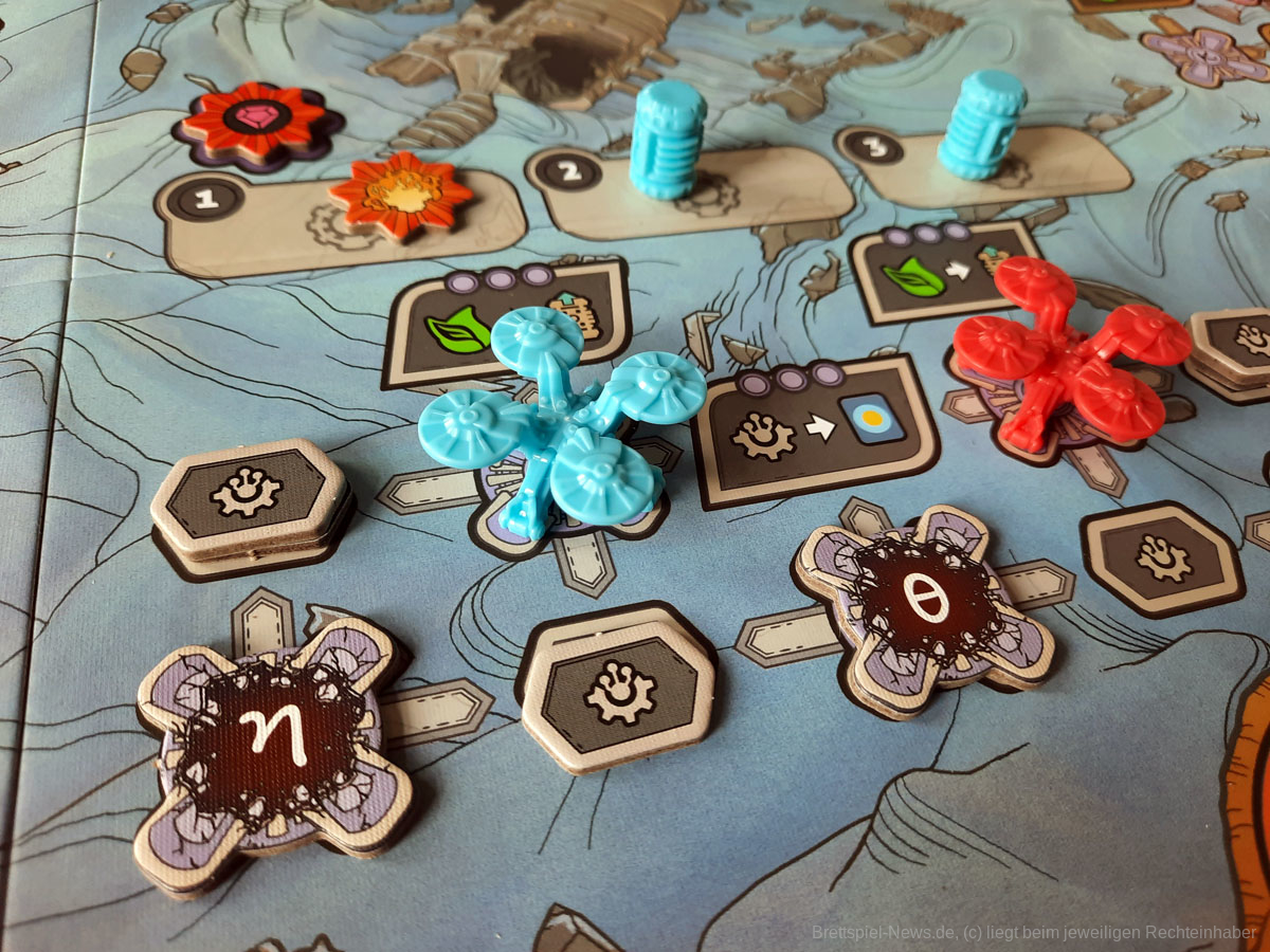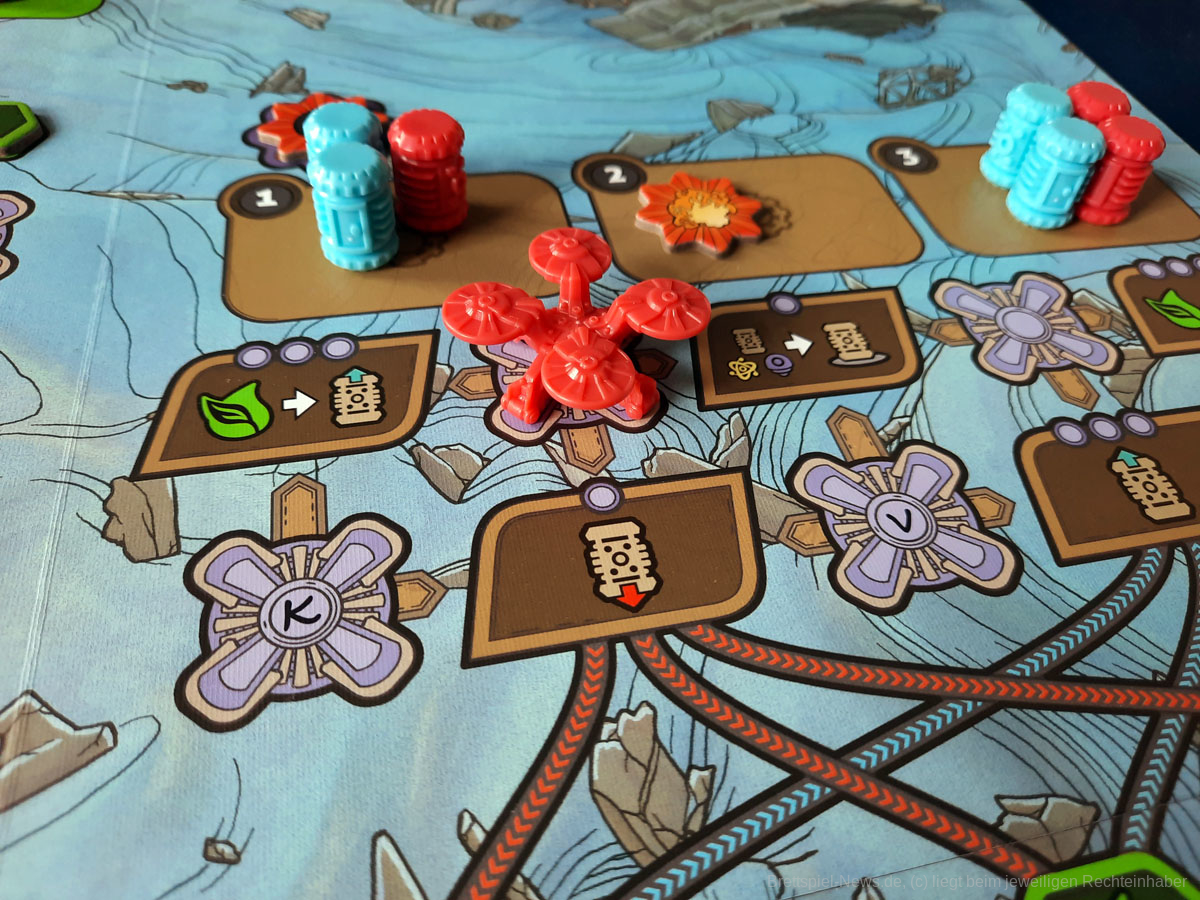 Die heißbegehrten Drohnen-Landeplätze gehen weg wie warme Semmel und wer zuletzt in der Runde dran ist, hat mitunter doch mit Nachteilen zu kämpfen, da nur wenige attraktive Plätze übrigbleiben. Doch CRYO bietet hier eine elegante Möglichkeit, die Reihenfolge zu ändern. Indem die eigenen Drohnen vorzeitig zur eigenen Plattform geholt werden, verzichtet man zwar auf eine oder mehr Aktionen, ist aber fortan deutlich früher dran als die anderen.