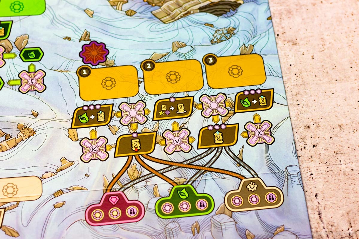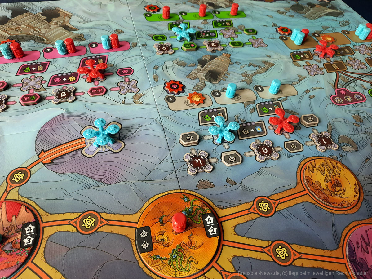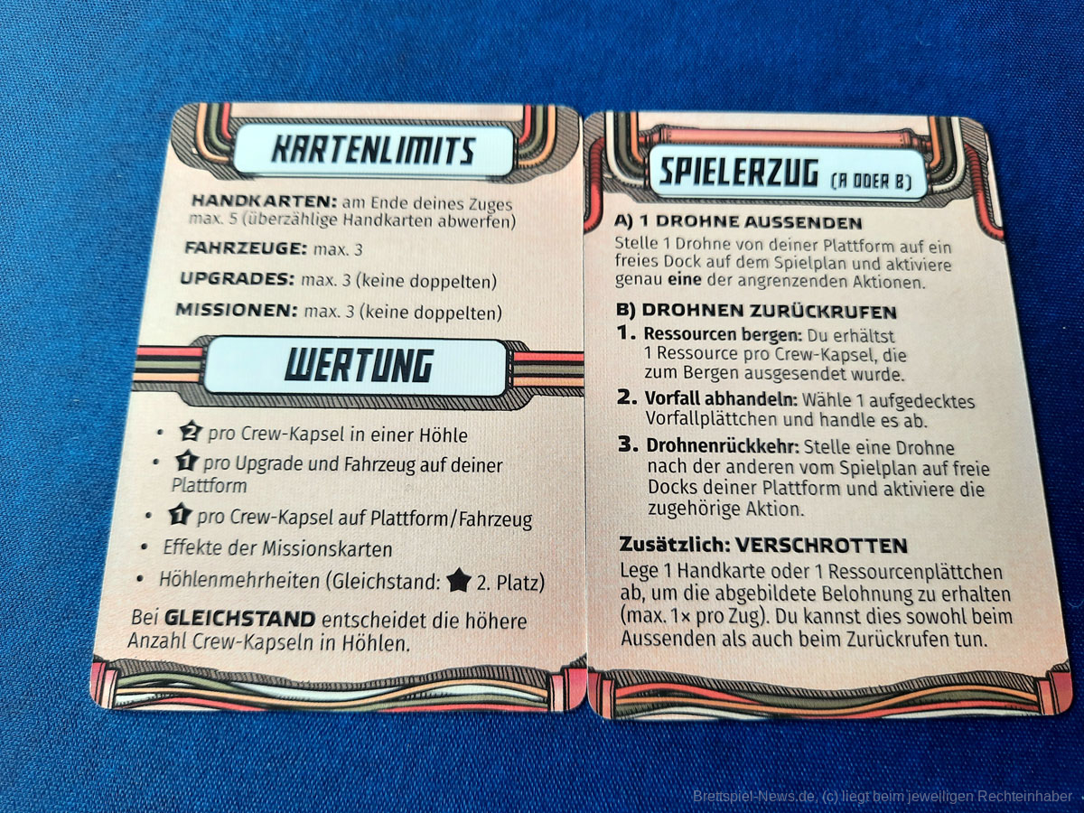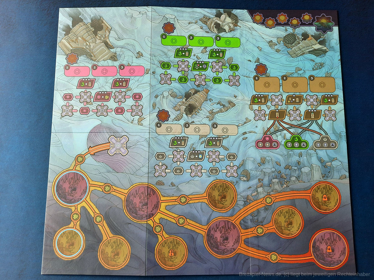Die heißbegehrten Drohnen-Landeplätze gehen weg wie warme Semmel und wer zuletzt in der Runde dran ist, hat mitunter doch mit Nachteilen zu kämpfen, da nur wenige attraktive Plätze übrigbleiben. Doch CRYO bietet hier eine elegante Möglichkeit, die Reihenfolge zu ändern. Indem die eigenen Drohnen vorzeitig zur eigenen Plattform geholt werden, verzichtet man zwar auf eine oder mehr Aktionen, ist aber fortan deutlich früher dran als die anderen.