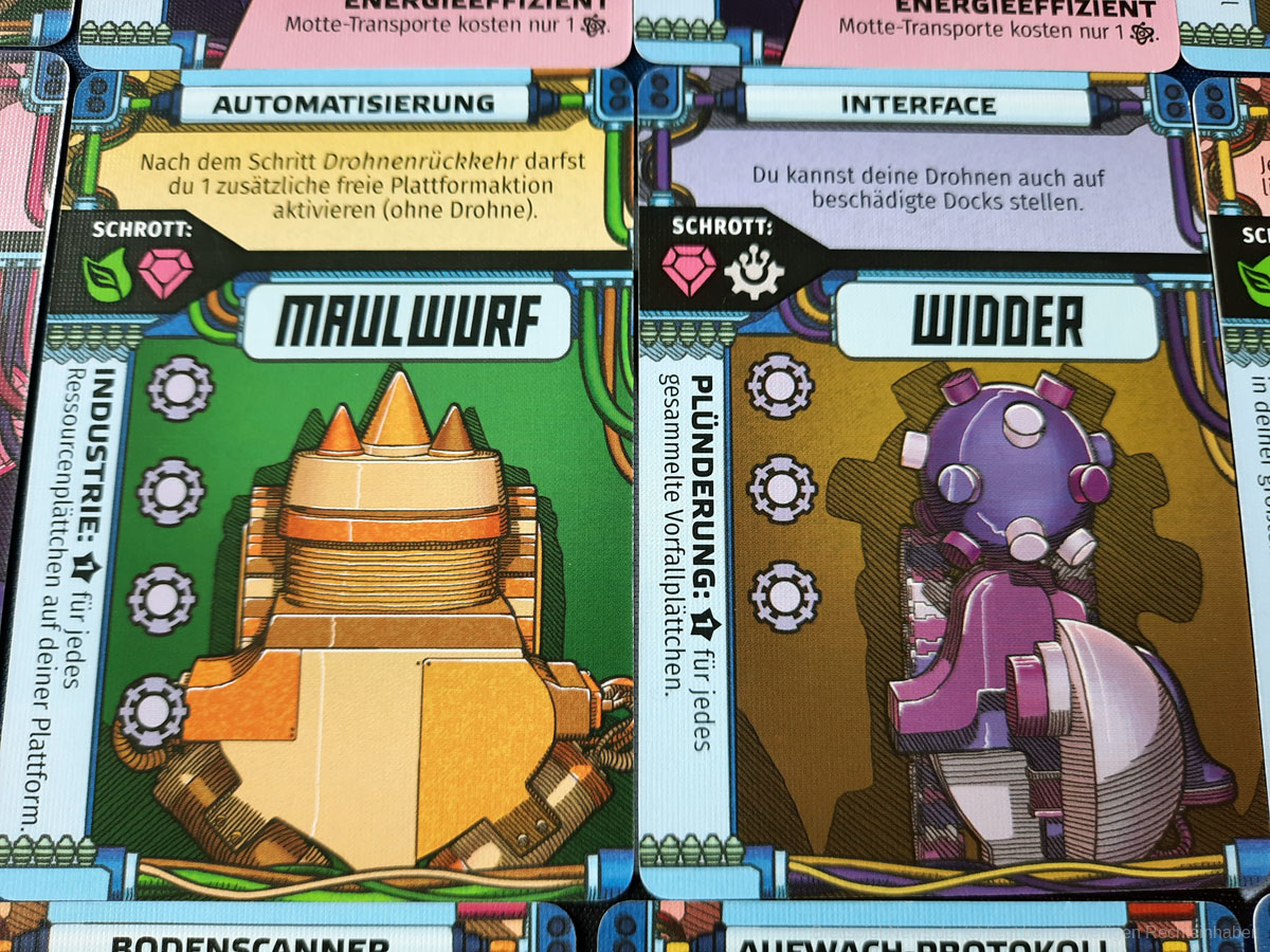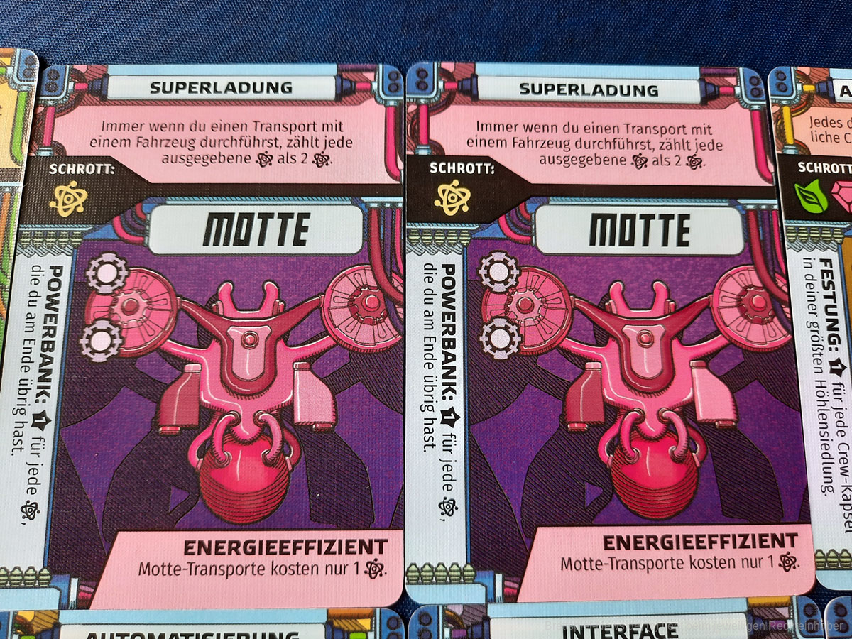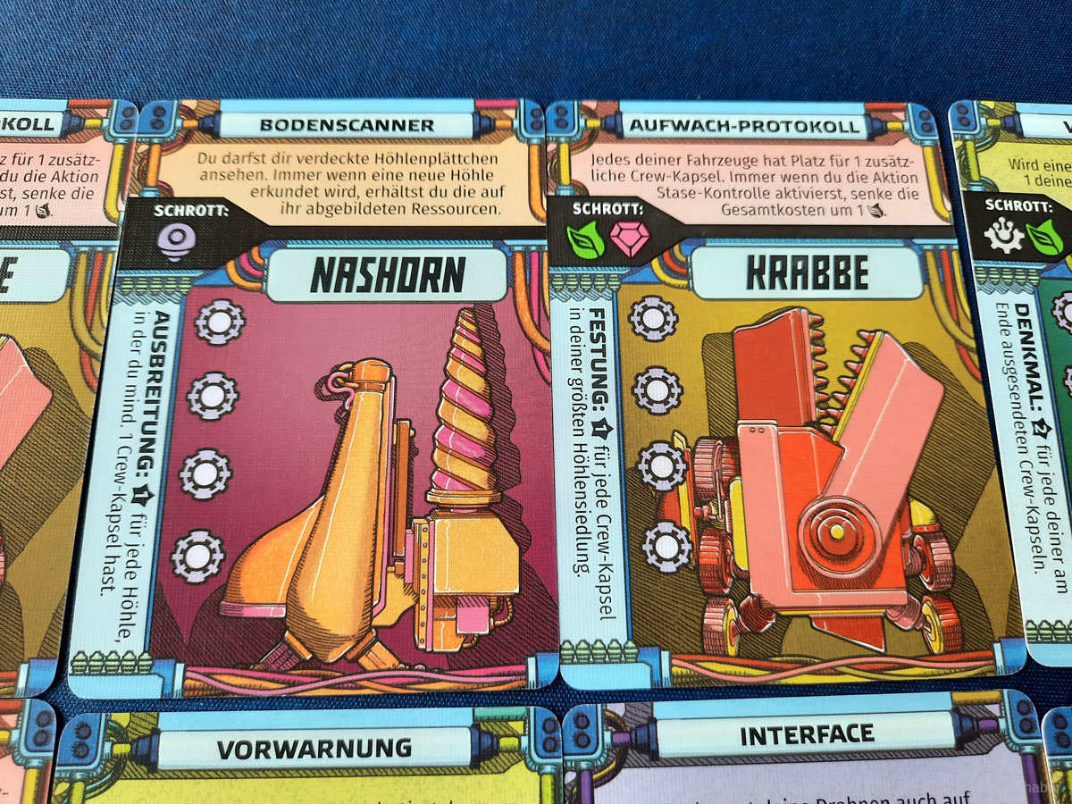 Der Mechanismus, dass die Handkarten für vier verschiedene Effekte eingesetzt werden können (Fahrzeug, Zielerreichung zum Spielende, Verbesserung und Ressourcen), ist klasse. Stets gilt es abzuwägen, zu welchem Zweck eine Karte eingesetzt wird. Die Effekte der gezogenen Karten beeinflussen dabei stark die eigene Spielweise, wodurch die Varianz und Abwechslung über mehrere Spiele hinweg gesteigert wird.
