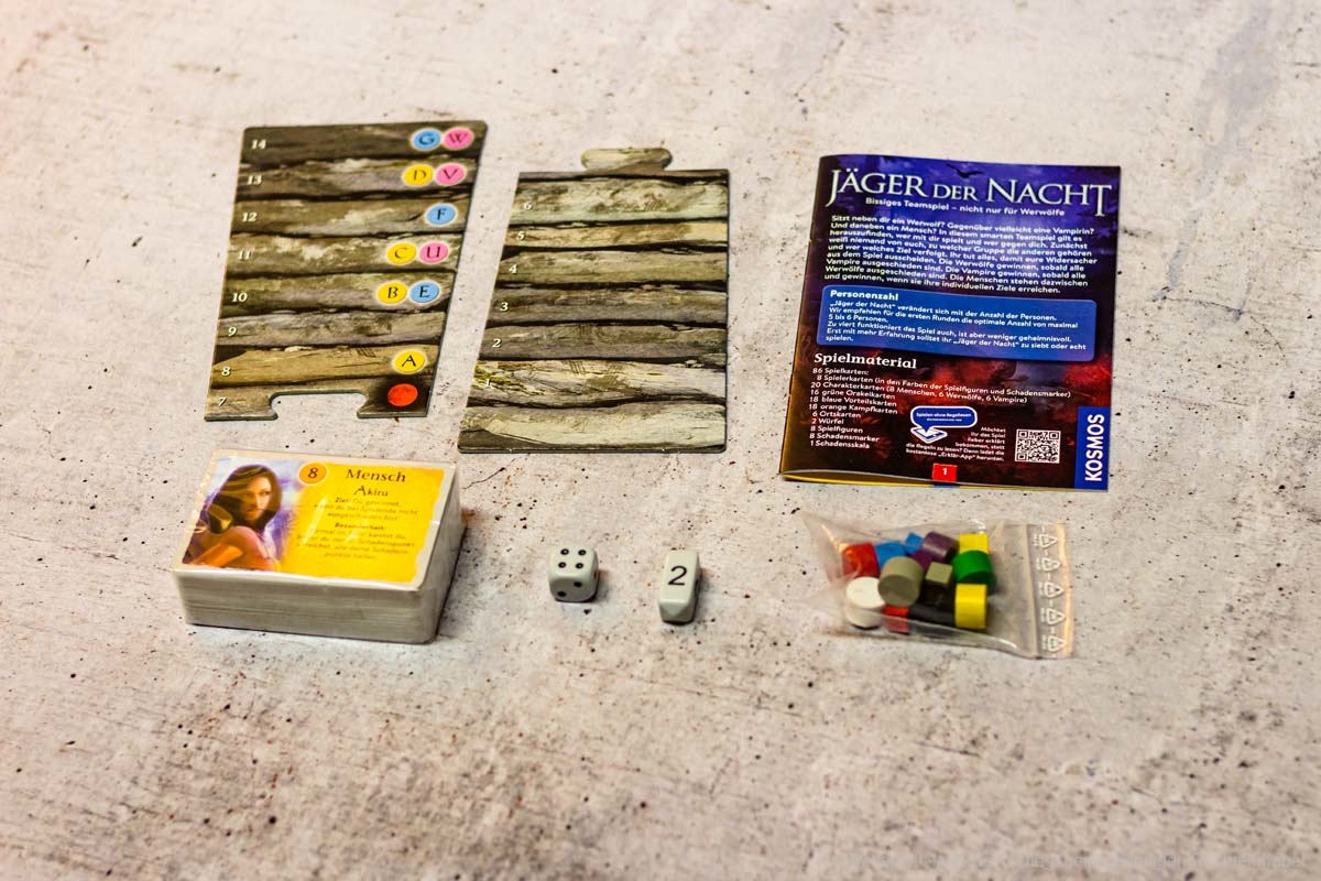 JÄGER DER NACHT enthält insgesamt 20 Charakterkarten, 16 Orakelkarten, 18 Vorteilskarten, 18 Kampfkarten, 6 Ortskarten sowie 2 Würfel, eine zweiteilige Lebenspunktskala aus Pappe und unterschiedliche Marker aus in den Spielerfarben eingefärbtem Holz.