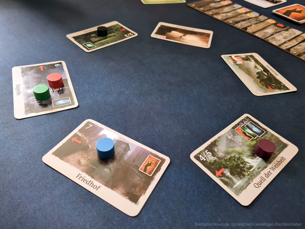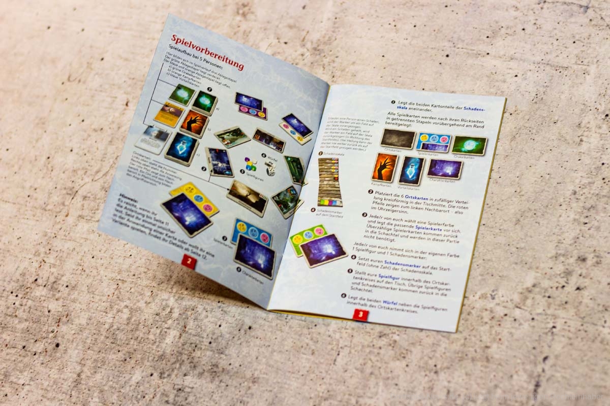 Qualitativ entspricht das Spielmaterial voll und ganz seinem Zweck. Der Druck und die Verarbeitung der Karten sind von guter Brettspielqualität und auch an den Holzmarkern gibt es nichts zu meckern. Das Artwork der unterschiedlichen Kartenstapel weist jedoch wenig Kontinuität auf. Während die Orts-, Vorteils- und Kampfkarten ein eher mittelalterliches Fantasyartwork mit Rüstungsteilen, alten Kapellen und verfallenen Häusern besitzen, entspringen die Charakterartworks eher der Welt von Teenager-Serien und Filmen wie Twilight oder Vampire Diaries, was einen recht starken Kontrast herstellt. Das Regelheft erklärt die Regeln kurz und bündig, wobei auch die optionale Kosmos-Erklär-App unterstützt wird, die den Aufbau und die Regeln erklärt, ohne dass das Regelheft aufgeschlagen werden muss. Durch die guten grafischen Beispiele und kurzen Regeltexte lässt sich das Regelheft aber auch kurz vor Spielbeginn noch studieren oder während des Spiels als Nachschlagewerk bereithalten.