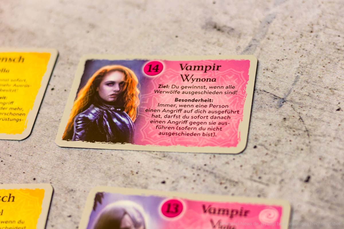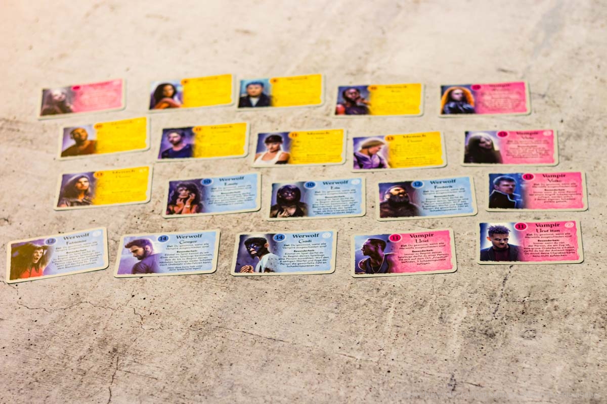 Der größte Elefant im Raum ist aber das Artwork. Ich kann beim besten Willen nicht verstehen, warum das Artwork angepasst worden ist, um damit eine so spezifische Zielgruppe anzusprechen versucht. Ich zähle mich selbst mal nicht zu dieser Gruppe und gönne es allen, die das Artwork mögen. Aber die „sexy Vampire“ und „sexy Werwölfe“, bei denen selbst die Twilight-Reihe erröten würde, ist so polarisierend, dass allein das Artwork ein Grund für sehr viele Spielgruppen sein wird, das Spiel zu überspringen. Generell hat JÄGER DER NACHT eine gewisse Vergangenheit mit unterschiedlichen Artworks zu haben, da die erste Fassung aus dem Jahr 2005 noch im Anime-Stil erschien (was aber verständlicher ist als die aktuelle Version, da es von einem japanischen Spieleautoren stammt), die extra für die deutsche Erstfassung mit einem eher neutraleren Fantasyartwork ersetzt wurde. Die Entscheidung für den neuen Artstil muss jedoch wirklich mit voller Absicht getroffen worden sein, obwohl es nun wirklich nicht unbekannt ist, was viele vom Genre der Vampire und Werwölfe halten. Wäre der alte Fantasystil beibehalten oder ein familientauglicher Comicstil wie bei der WERWÖLFE-Reihe von RAVENSBURGER angewandt worden, bin ich mir sicher, dass JÄGER DER NACHT ein klasse Geheimtipp für alle Spielgruppen geworden wäre, die von anderen Social Deduction-Spielen eingeschüchtert worden sind, oder einfach mal Interesse am Genre haben und einen Einstieg suchen.