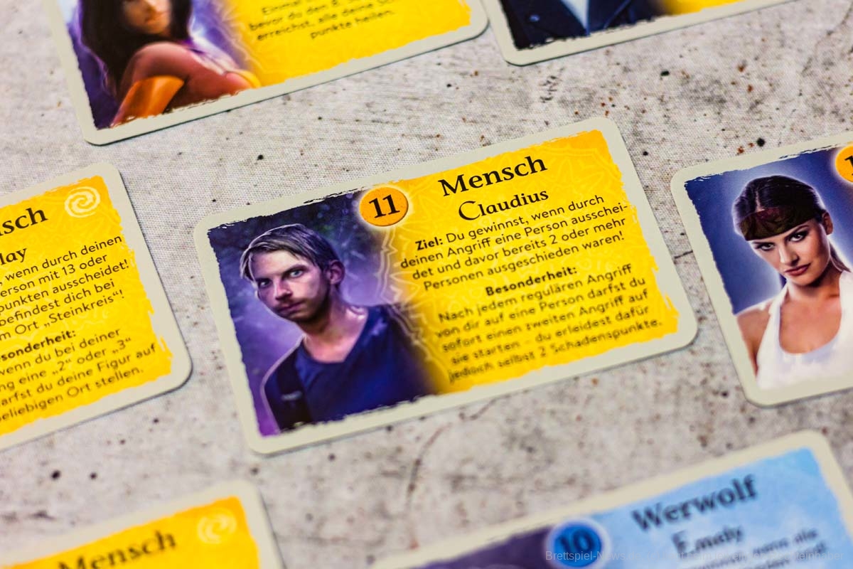Insbesondere die einzigartigen Ziele der Menschen-Fraktion haben mich begeistern können, da sich hier meist ein gewisser Knackpunkt für viele Social Deduction-Spiele befindet. In meinem liebsten Spiel des Genres, HUMAN PUNISHMENT, hat die Fraktion der Gesetzlosen theoretisch die schlechtesten Karten, da sie ebenfalls ohne Team unterwegs sind und eigentlich nur Chaos stiften können. Ein wirklicher Sieg eines Gesetzlosen ist bei HUMAN PUNISHMENT besonders für Anfänger ziemlich unmöglich. JÄGER DER NACHT hat dieses Problem nicht, da Menschen so individuelle Ziele verfolgen können, dass ich mir in unseren Spielrunden eher gewünscht habe, ein Mensch zu sein als alles andere. Ebenfalls wird der Wiederspielwert durch die einzigartigen Ziele immens erhöht, da die 8 Menschenkarten immer wieder neue Aspekte in den Spielverlauf einbringen können.