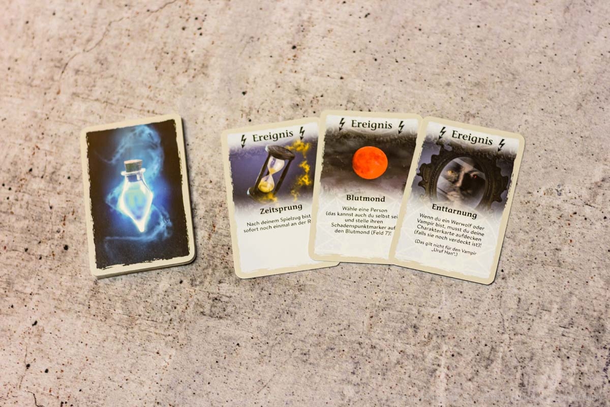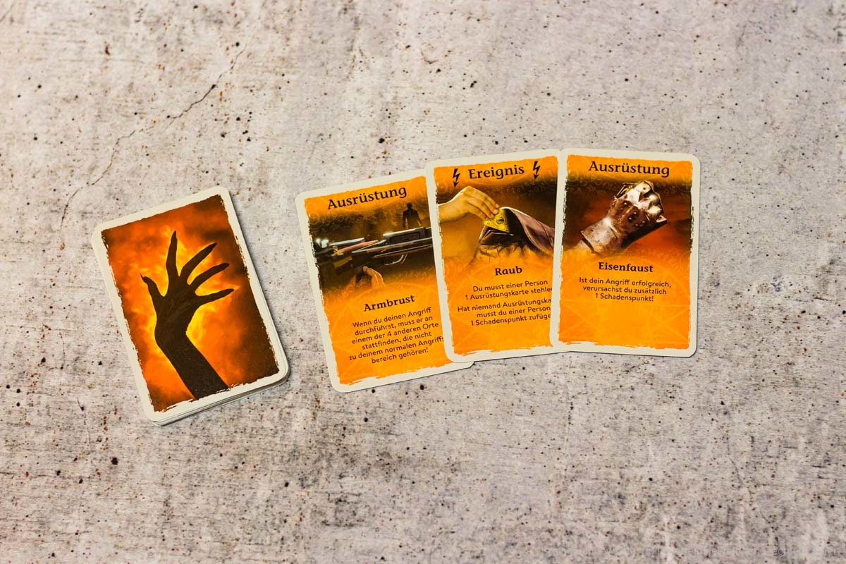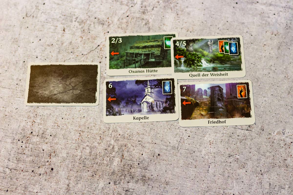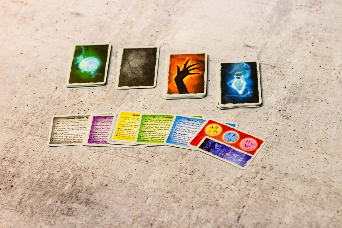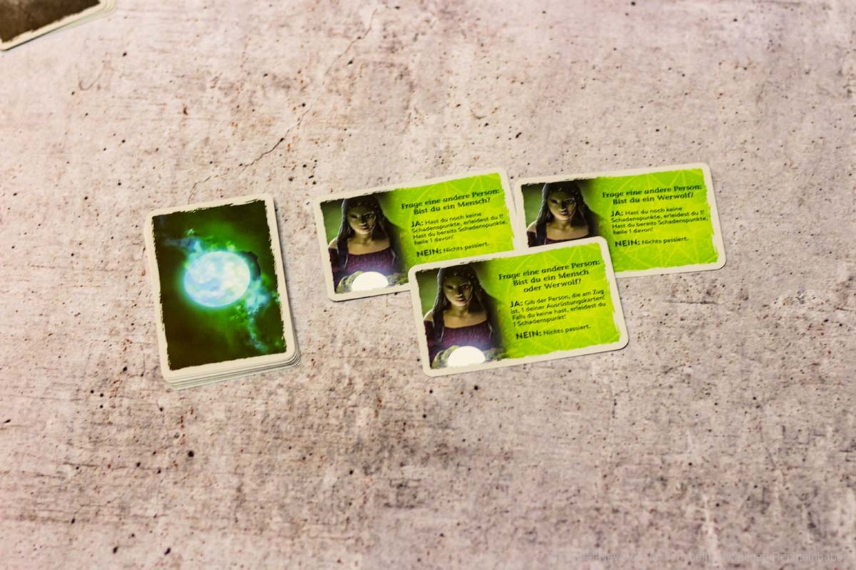 Insgesamt gibt es drei unterschiedliche Kartenstapel, auf die sich diese Ortskarten beziehen können: Vorteilskarten, Kampfkarten oder Orakelkarten. Vorteilskarten bringen (wie der Name schon sagt) einen Vorteil ein, indem sie zum Beispiel Spielende mit Ausrüstungen versorgen. Kampfkarten können Schadenspunkte zufügen, Ausrüstungen stehlen oder die Kampfeigenschaften von Spielenden verstärken. Orakelkarten dienen JÄGER DER NACHT aber als Rückgrat, da diese die Stelle der sozialen Interaktion einnehmen.