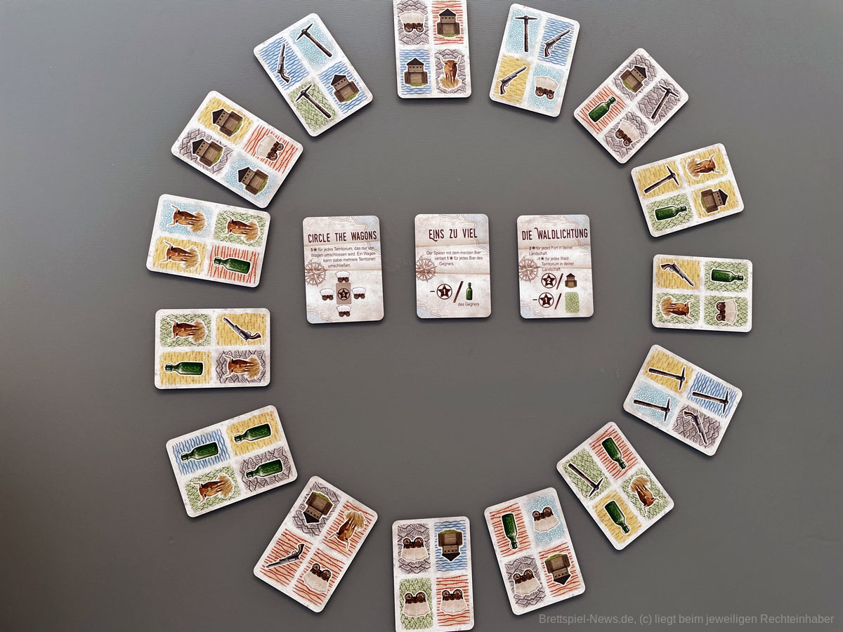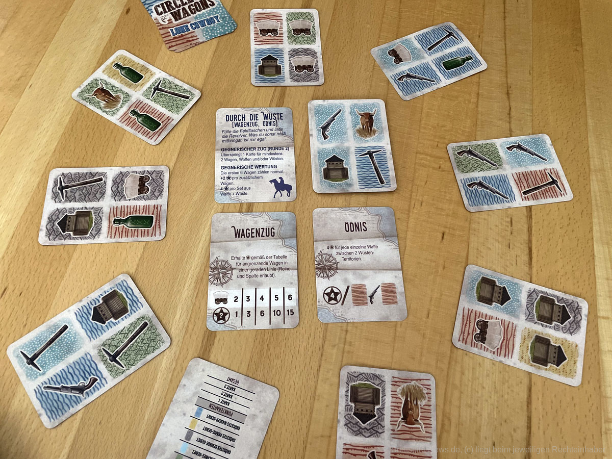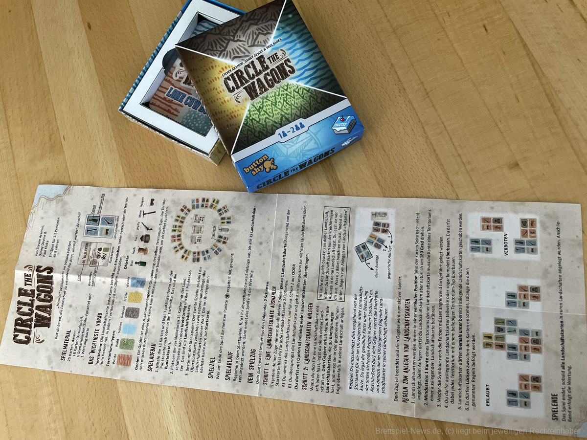 Das Spiel benötigt auf dem Tisch durch die wachsenden Landschaften und den Kartenkreis leider ein bisschen mehr Platz als bei einem kleinen Kartenspiel üblich. Daher ist es nur bedingt als Reisespiel geeignet. Innerhalb der Microspielreihe von button shy können wir CIRCLE THE WAGONS Legespielbegeisterten, die nach einem strategischen Kartenspiel für zwischendurch suchen, durchaus empfehlen.