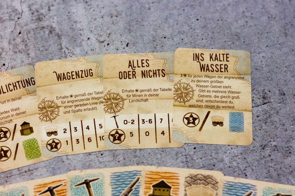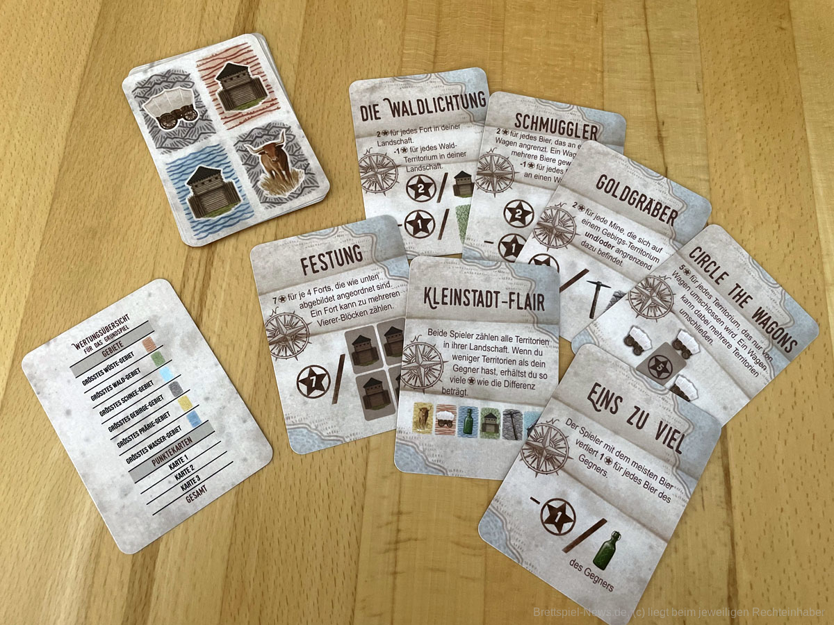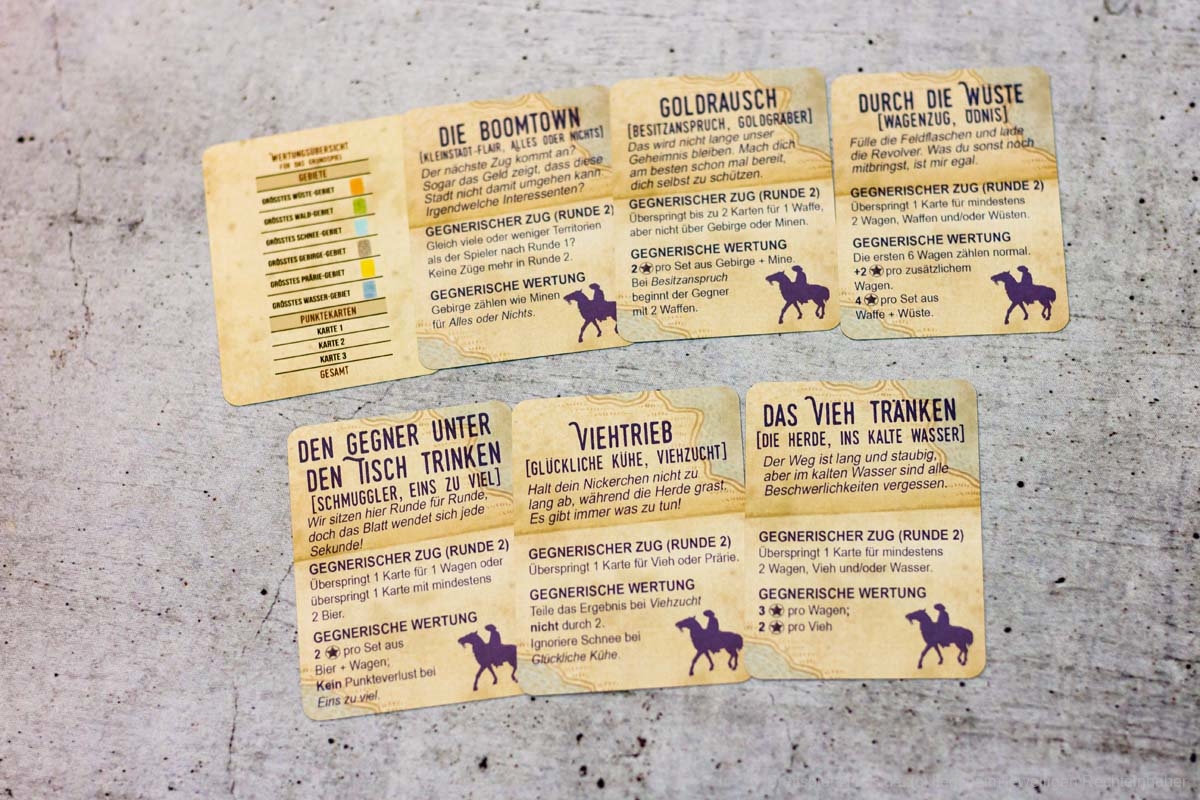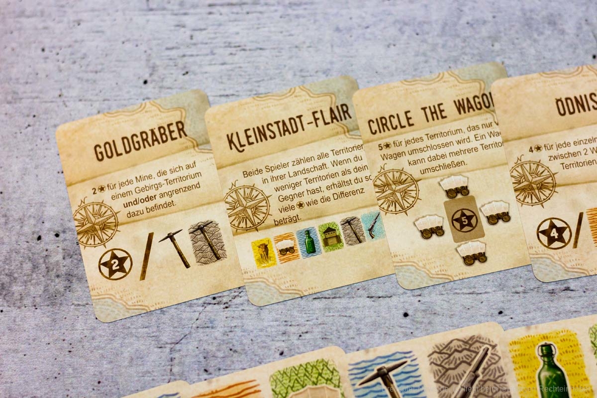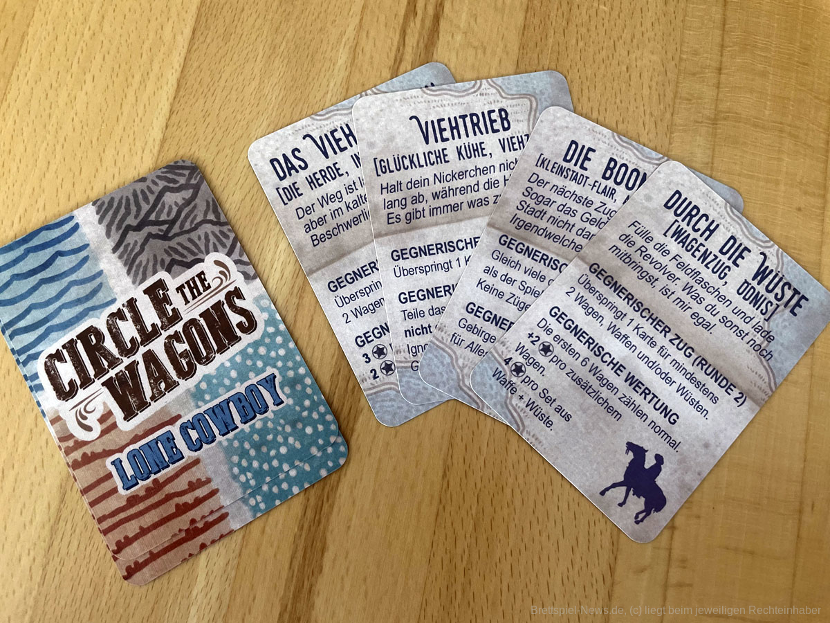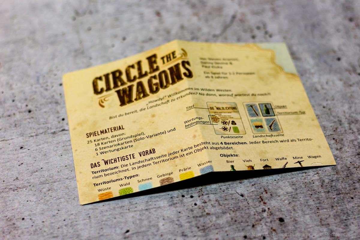 Erstaunlicherweise gelingt es CIRCLE THE WAGONS mit 18 Karten strategischen Tiefgang und Knobelspaß zu erzeugen. Es präsentiert sich als cleveres Legespiel mit einfachen Regeln und geringer Spielzeit, sodass die zweite und dritte Partie nicht lange auf sich warten lässt. Zu zweit hat es uns am besten gefallen, wenn beide dasselbe Ziel verfolgen. Im Solospiel sind zusätzlich zur eigenen Wertung, die wechselnde Priorisierung beim Landschaftsbau und die abweichende Endwertung des Gegners einzukalkulieren. Das hat das kleine, aber feine Kartenspiel für uns unnatürlich verkompliziert. Trotzdem können Solospielende hier gerne einmal einen Blick drauf werfen, denn interessant ist dieses Landschaftsplanen in unterschiedlichen Szenarien allemal.