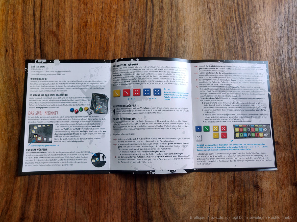 Bevor jedoch gewürfelt wird, rückt der Verfolger zunächst ein Feld weiter vor, also zu Beginn der ersten Runde auf das Feld 1. Die Bewegungen des Verfolgers werden auf der Laufleiste jeweils durch einem zweiten Schrägstrich markiert - die Felder sind damit ausgekreuzt. Danach müssen sich alle Flüchtenden miteinander absprechen, welche Würfel geworfen werden sollen. Nach einem Würfelwurf werden die benutzten Würfel in den Deckel der Spielschachtel gelegt. Dabei ist es erlaubt direkt alle oder auch nur einen einzigen (nicht weißen) Würfel zu werfen. Aber Achtung: sobald alle Würfel verbraucht wurden, rückt der Verfolger ein paar Extrafelder vor, je nachdem, wie viele offene (also angefangene, aber noch nicht abgeschlossene) Aufträge die Person mit den meisten von diesen offenen Aufträgen hat. Alle Spielenden müssen die gleiche Anzahl an Feldern für den Verfolger auf ihren Leisten auskreuzen.