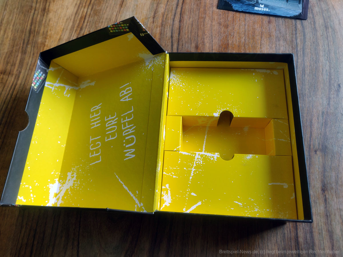 Die Box an sich fühlt sich sehr wertig und robust an und lässt sich wunderschön von der Seite aufklappen. Der Innendeckel dient dabei sogar als Würfelablage für bereits in einer Spielrunde benutzte Würfel. Ob das nötig ist, ist allerdings eine andere Frage. Eine weitere Frage ist außerdem, ob die Schachtel nicht auch deutlich kleiner hätte ausfallen können. Denn unterhalb des (wahrscheinlich übertrieben großen) Würfelblocks befinden sich nur die zehn Würfel in einer proportional winzigen Aussparung. Mindestens die Hälfte der Schachtel ist also nur mit Luft gefüllt.