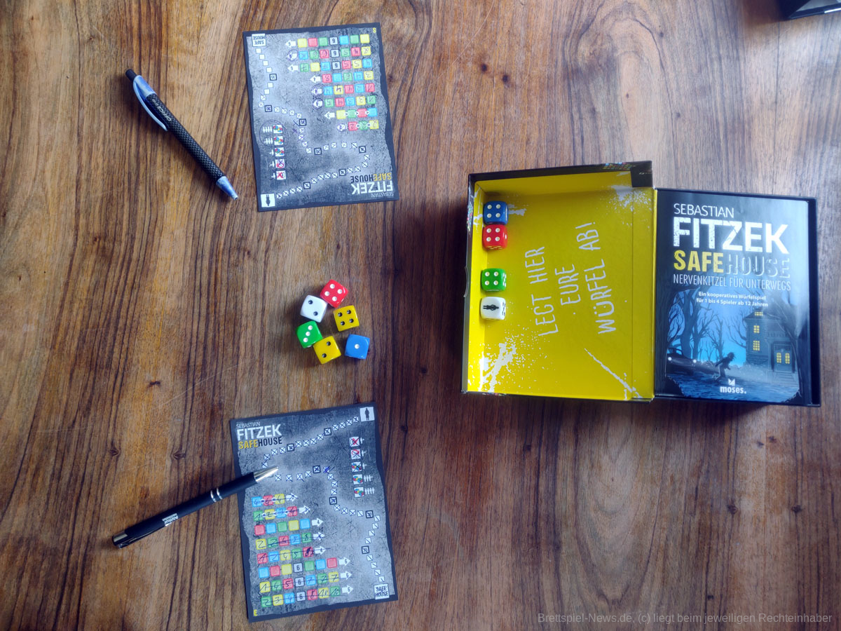 In SEBASTIAN FITZEK SAFEHOUSE – DAS WÜRFELSPIEL sitzt ihr in der Klemme und versucht, euren Verfolger abzuschütteln. Das gelingt nur, wenn ihr mithilfe von Würfeln Aufträge erfüllt und so die Hindernisse auf eurem Fluchtweg überwindet. Dabei gewinnen oder verlieren die Spielenden alle gemeinsam. Um die Aufträge zu erfüllen ist es wichtig, dass alle Flüchtenden sich miteinander absprechen, um schneller voranzukommen, denn mit jedem Wurf kommt der Verfolger näher.