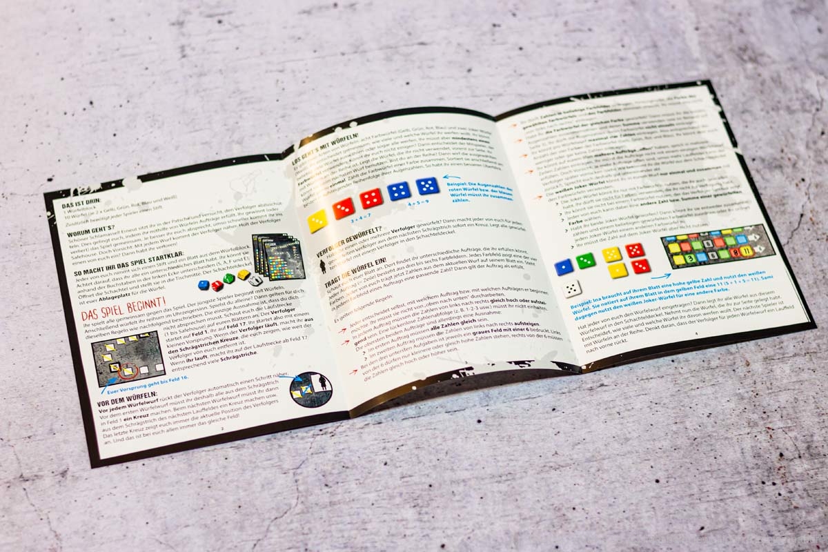 Viele der kleinen Sonderregeln, beispielsweise die Nutzung der Würfelzahlen oder Summen (bei mehreren Würfeln derselben Farbe), sind einfach als Stichpunkte untereinander aufgeführt. Dadurch muss man häufig mehr suchen als nötig. Ebenso gibt es zwar viele Grafiken und Beispiele, aber eine kompakte Rundenübersicht fehlt und die einzelnen Abschnitte sind oft weniger intuitiv benannt („Los geht’s mit Würfeln!“ statt „Rundenablauf“). Die Anleitung in Gänze zu lesen und das Spiel zu erlernen ist auf diese Weise also denkbar einfach, aber zwischendurch im Spiel schnell mal etwas nachschlagen unnötig frustrierend.