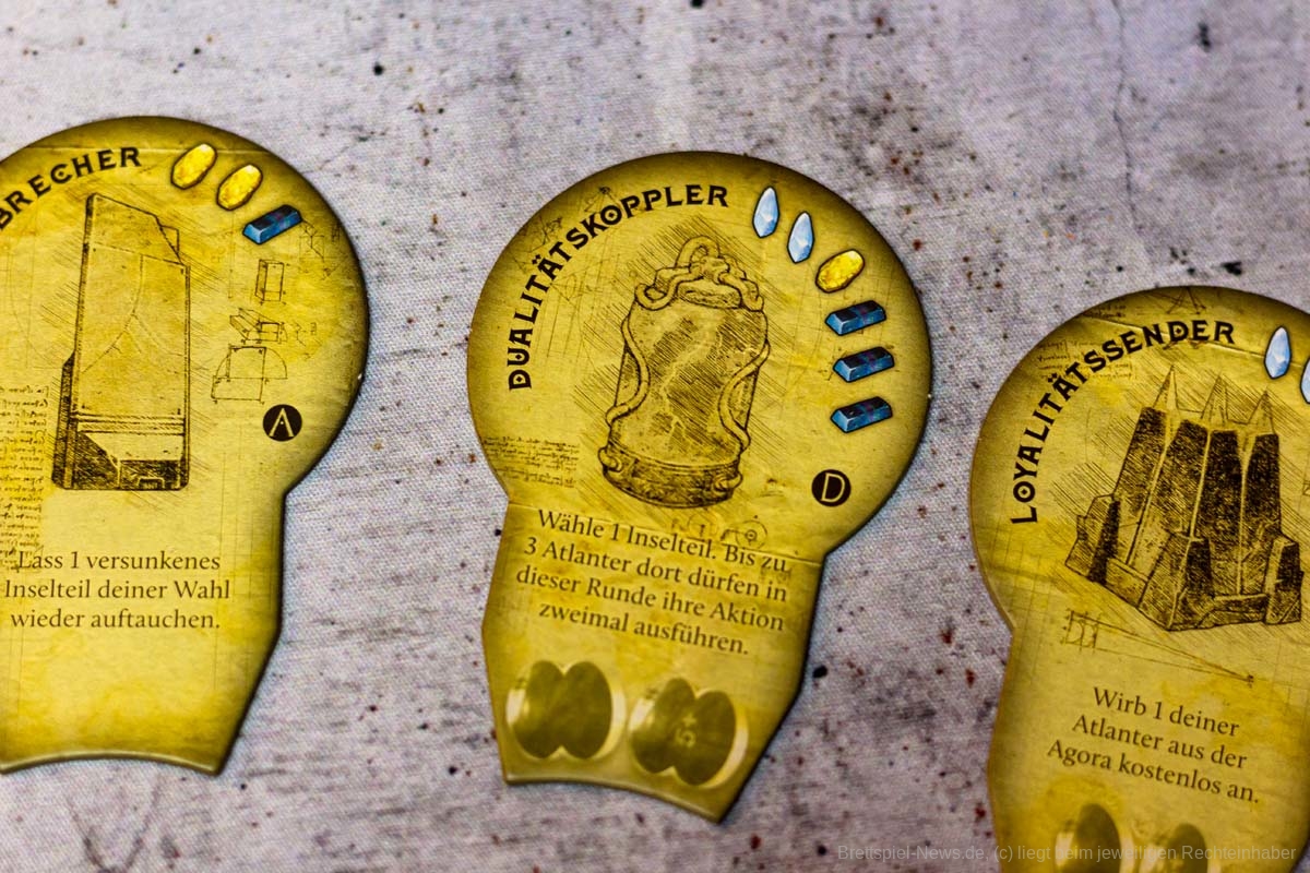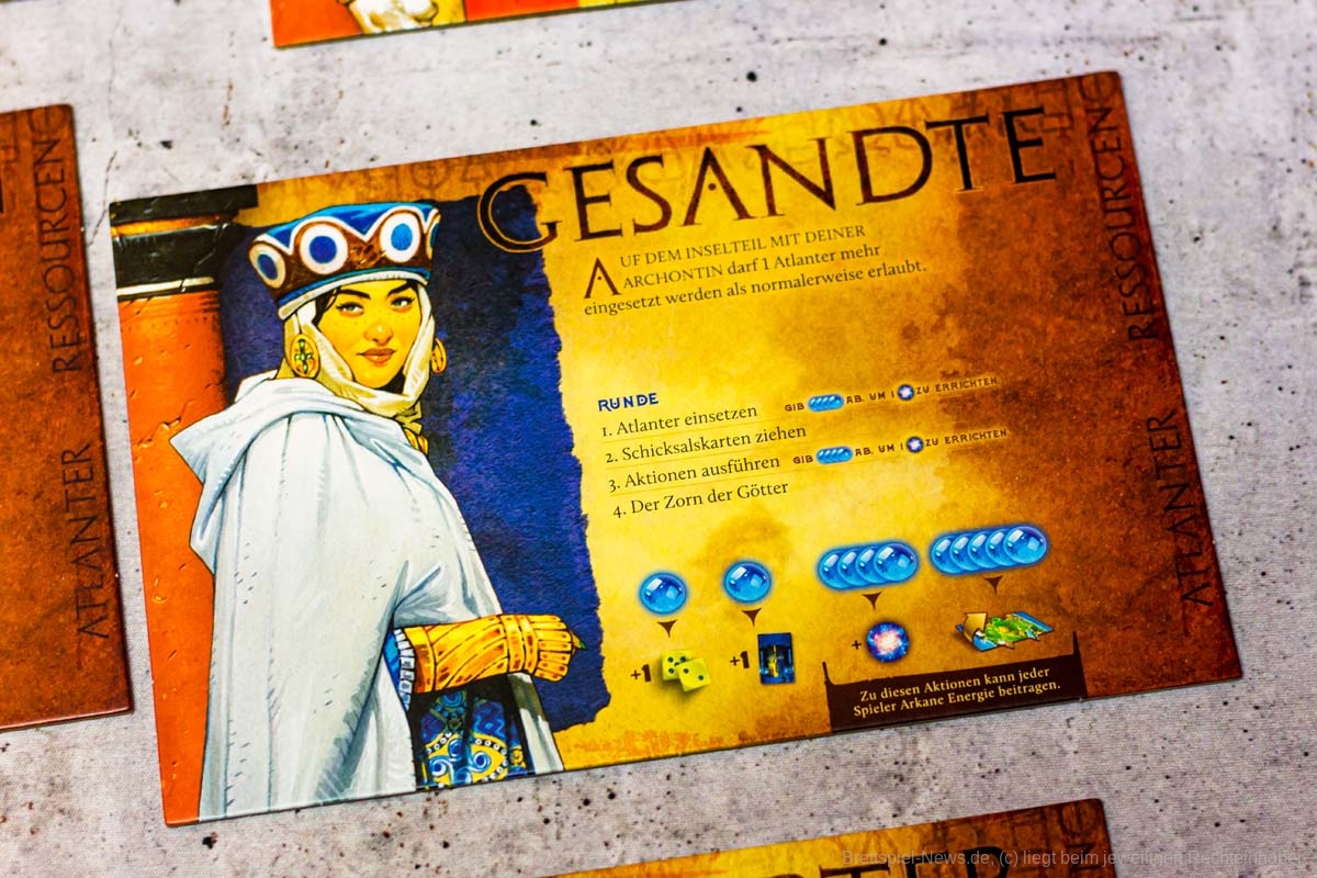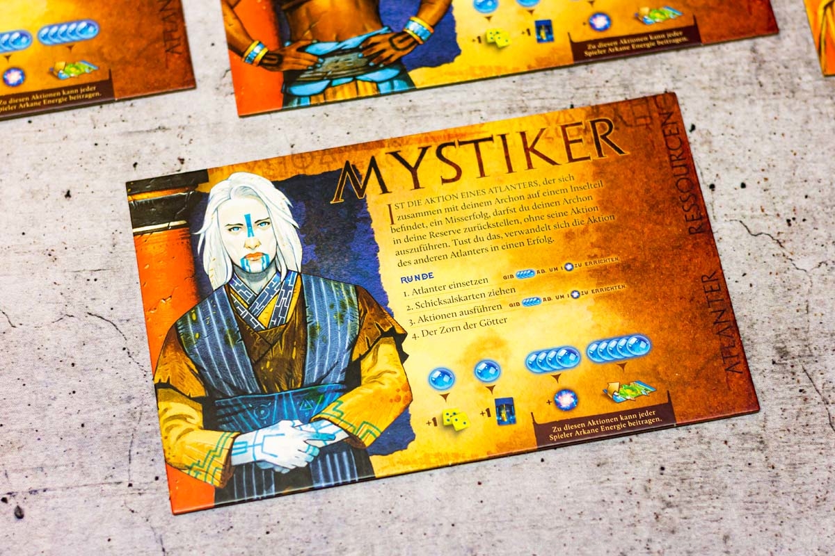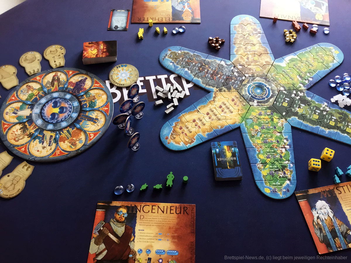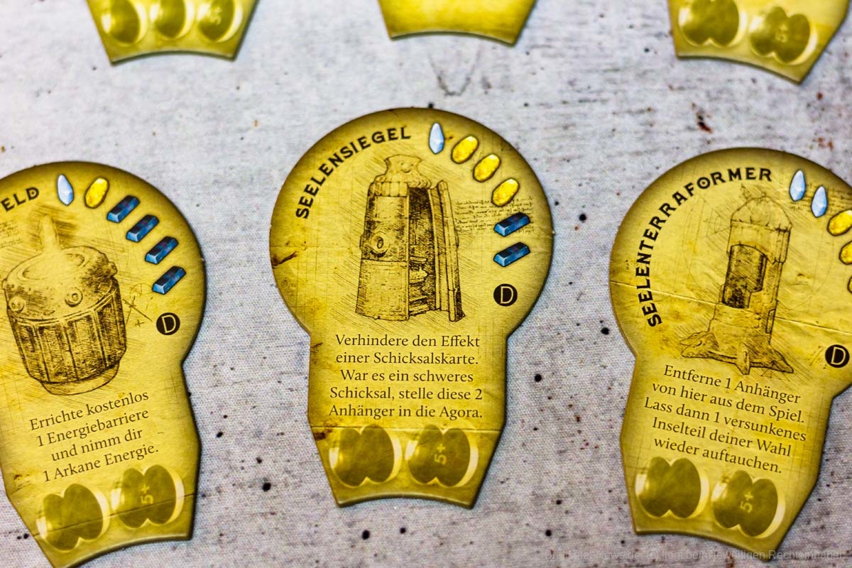 Der Aufbau des Spiels dauert durch seine vielen Inselteile etwas länger, doch auch diese vielen schweren Plättchen tragen zum Charme des Spiels bei. Die Materialien wirken passend und transportieren gemeinsam ein Spielgefühl. Einzig eine Spielhilfe mit den Effekten der verschiedenen Maschinenteile fehlt, denn gerade in Partien mit 5 oder mehr Personen, können nicht alle die kleinen Texte gut erkennen und das dauernde Herumreichen macht den aktuellen Spielstand etwas unübersichtlich. Doch die Effekte der Bauteile sind machtvoll und durchaus lohnend und nicht nur nettes Beiwerk. Durch seine einfache Rundenstruktur, die auch auf allen Archontableaus abgedruckt ist, und das zeitgleiche Agieren aller Spieler:innen, kann ATLANTIS RISING auch problemlos in Partien mit 7 Personen glänzen.