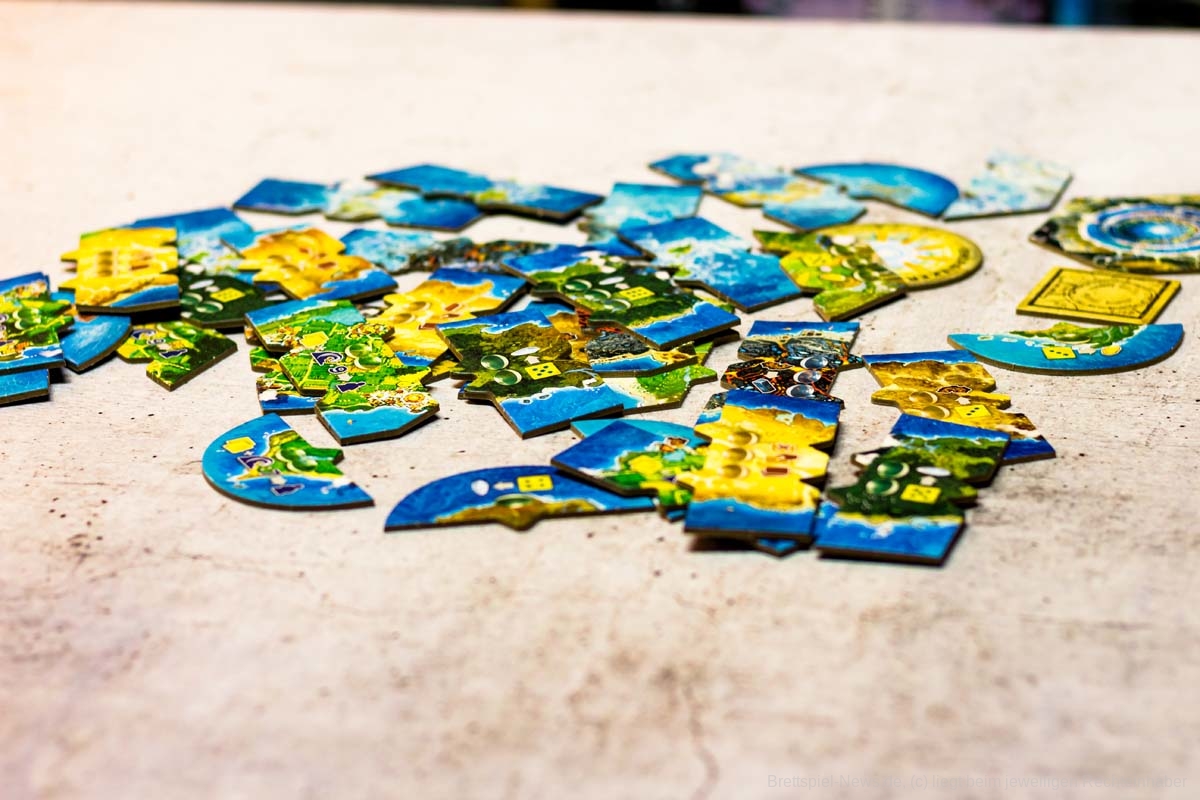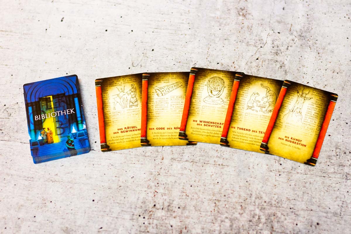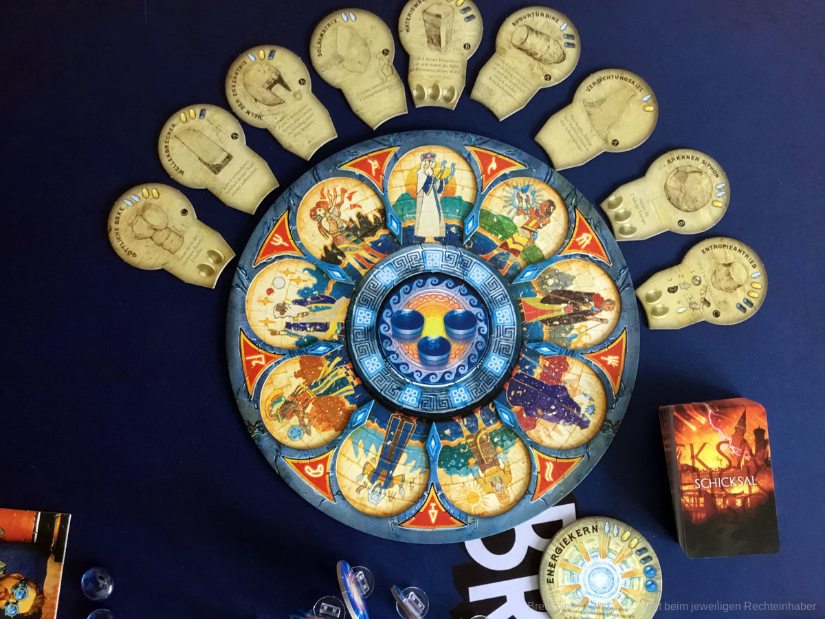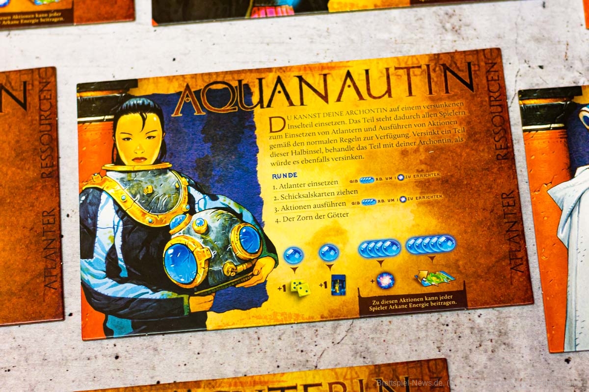 Der Aufbau des Spiels dauert durch seine vielen Inselteile etwas länger, doch auch diese vielen schweren Plättchen tragen zum Charme des Spiels bei. Die Materialien wirken passend und transportieren gemeinsam ein Spielgefühl. Einzig eine Spielhilfe mit den Effekten der verschiedenen Maschinenteile fehlt, denn gerade in Partien mit 5 oder mehr Personen, können nicht alle die kleinen Texte gut erkennen und das dauernde Herumreichen macht den aktuellen Spielstand etwas unübersichtlich. Doch die Effekte der Bauteile sind machtvoll und durchaus lohnend und nicht nur nettes Beiwerk. Durch seine einfache Rundenstruktur, die auch auf allen Archontableaus abgedruckt ist, und das zeitgleiche Agieren aller Spieler:innen, kann ATLANTIS RISING auch problemlos in Partien mit 7 Personen glänzen.