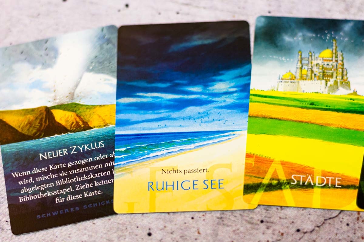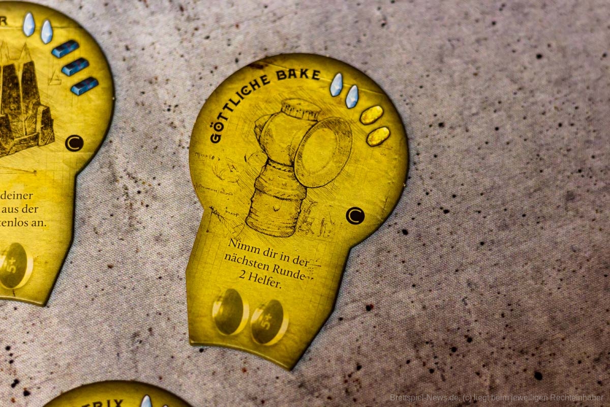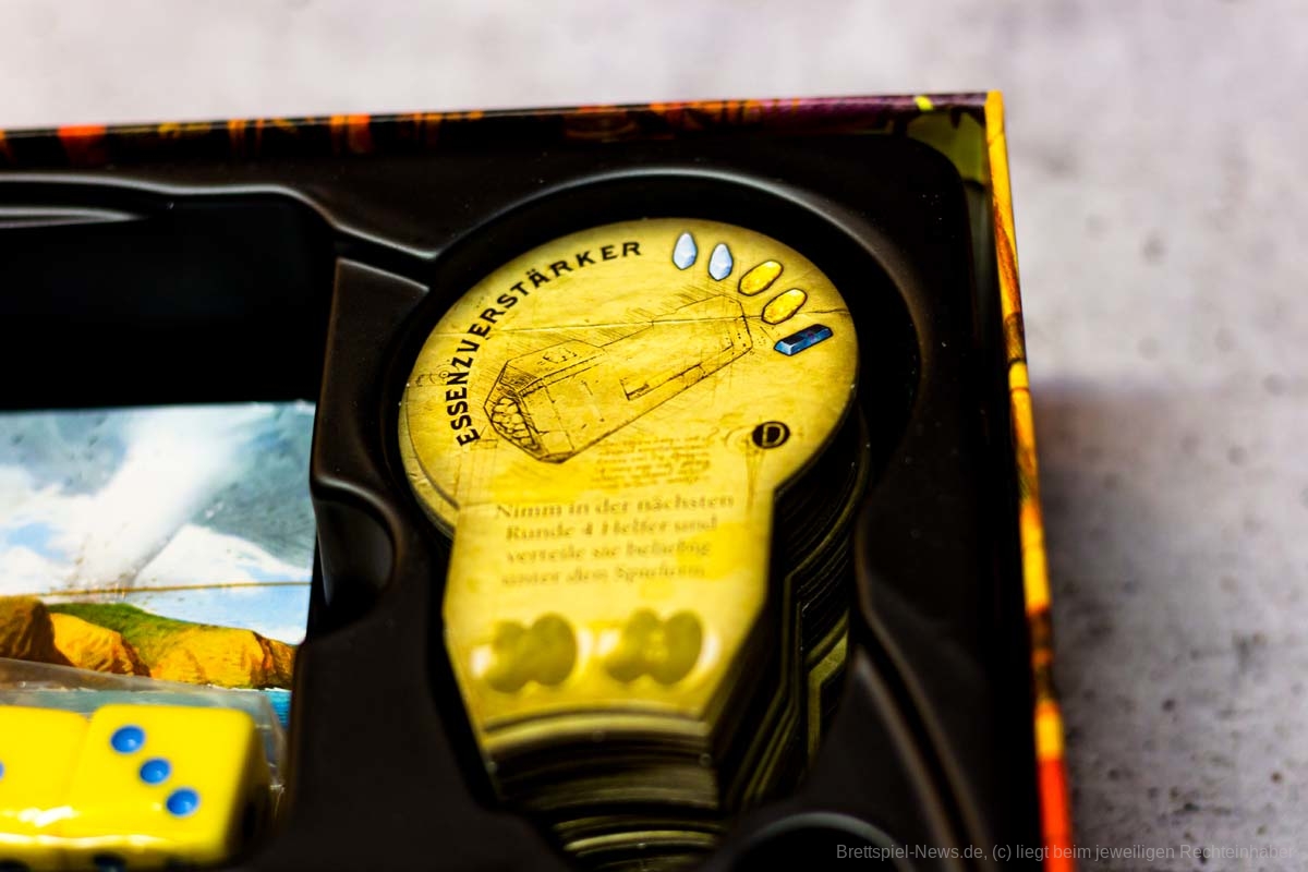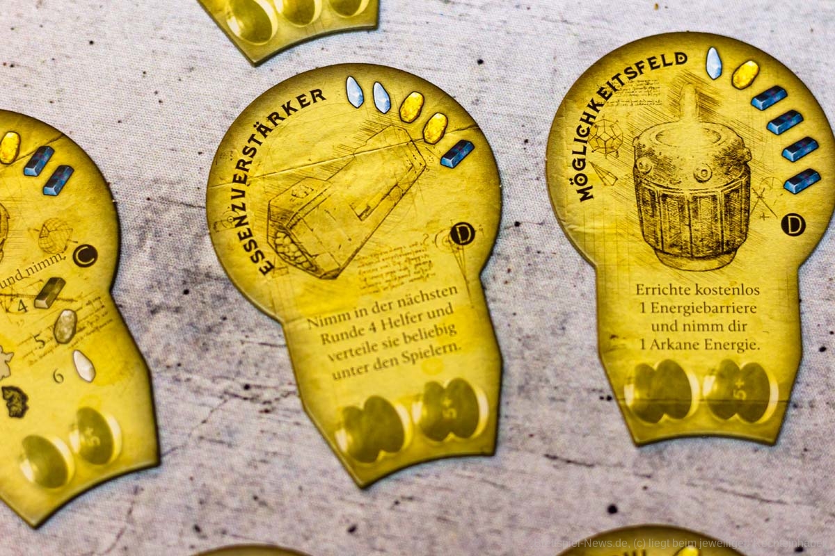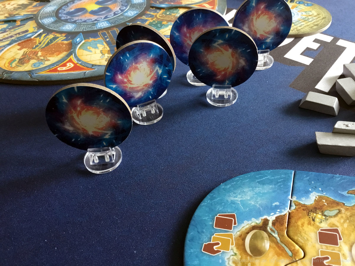 Der Aufbau des Spiels dauert durch seine vielen Inselteile etwas länger, doch auch diese vielen schweren Plättchen tragen zum Charme des Spiels bei. Die Materialien wirken passend und transportieren gemeinsam ein Spielgefühl. Einzig eine Spielhilfe mit den Effekten der verschiedenen Maschinenteile fehlt, denn gerade in Partien mit 5 oder mehr Personen, können nicht alle die kleinen Texte gut erkennen und das dauernde Herumreichen macht den aktuellen Spielstand etwas unübersichtlich. Doch die Effekte der Bauteile sind machtvoll und durchaus lohnend und nicht nur nettes Beiwerk. Durch seine einfache Rundenstruktur, die auch auf allen Archontableaus abgedruckt ist, und das zeitgleiche Agieren aller Spieler:innen, kann ATLANTIS RISING auch problemlos in Partien mit 7 Personen glänzen.