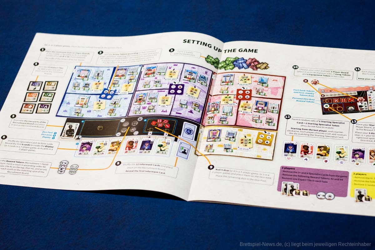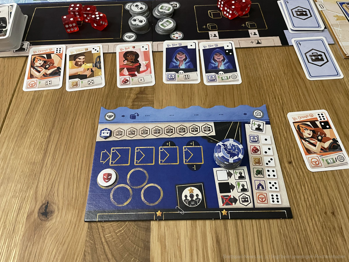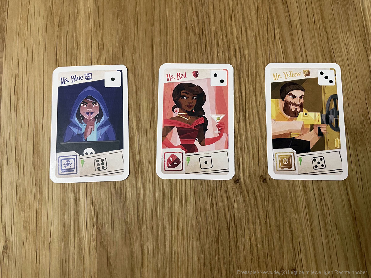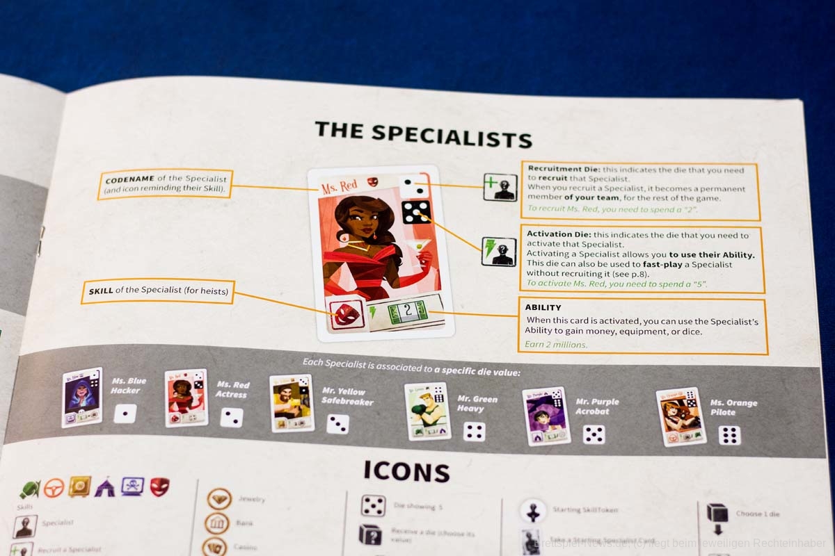 Im Anschluss kann aus den ausliegenden Spezialistenkarten ein neues Teammitglied angeheuert werden. Voraussetzung hierfür ist ein Würfel mit passender Augenzahl. Würfel auf bestimmten Feldern des eigenen Tableaus können um +/-1 manipuliert werden. Auf den Spezialistenkarten ist zudem ein zweiter Würfelwert angegeben, mit dessen Hilfe nach dem Anheuern die Spezialfähigkeit des Neuzugangs sowie aller Spezialisten:innen der gleichen Farbe aktiviert werden kann. Das sorgt für zusätzliches Geld (Siegpunkte), neue Würfel oder für Werkzeuge, die bei den Einbrüchen benötigt werden. Alternativ kann auf das dauerhafte Anheuern verzichtet werden und mithilfe des zweiten Würfelwertes ausschließlich die Sonderfähigkeit aktiviert werden. So gewählte Spezialisten:innen stehen dann für den Raub in dieser Runde zur Verfügung, werden aber am Ende der Runde abgeworfen.