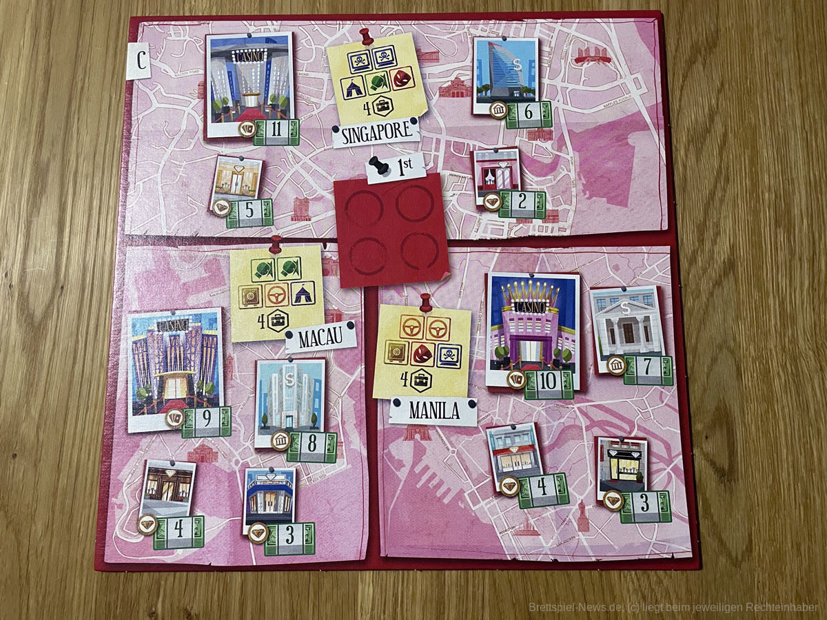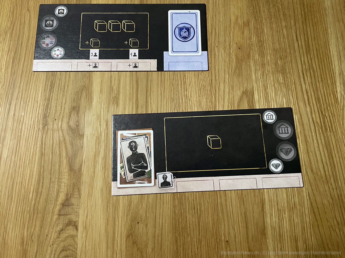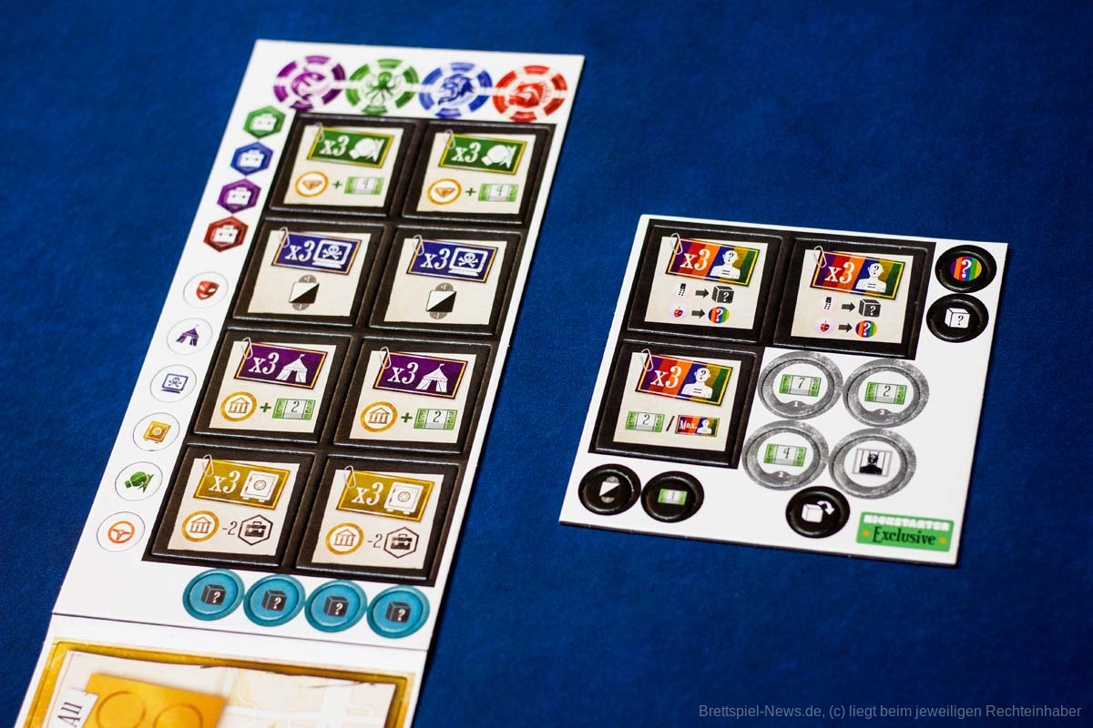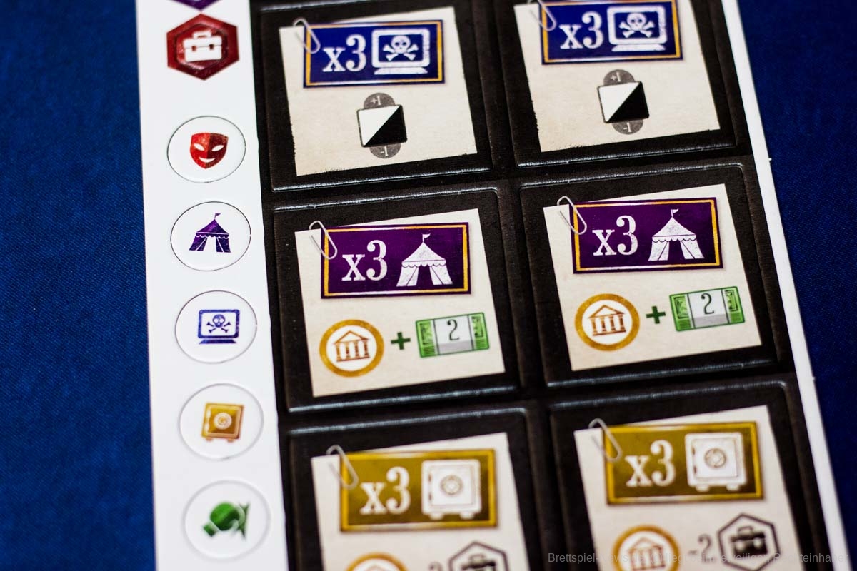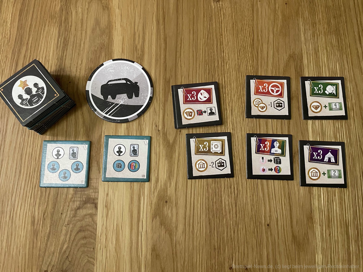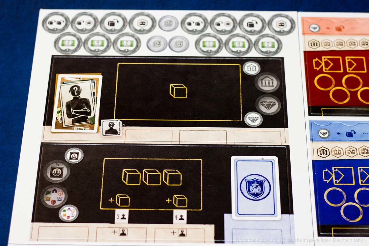 Sollte keine passende Spezialistenkarte verfügbar oder gewollt sein, kann stattdessen die aktuelle Informantenkarte aktiviert werden, die in gewisser Weise als „Trostpreis“ fungiert und einen einmaligen Bonus spendiert. Gelingt es, drei Spezialisten:innen des gleichen Typs im eigenen Team zu versammeln, wird dies mit einem besonderen Spezialistenplättchen belohnt, das für den Rest der Partie einen dauerhaften Vorteil gewährt.