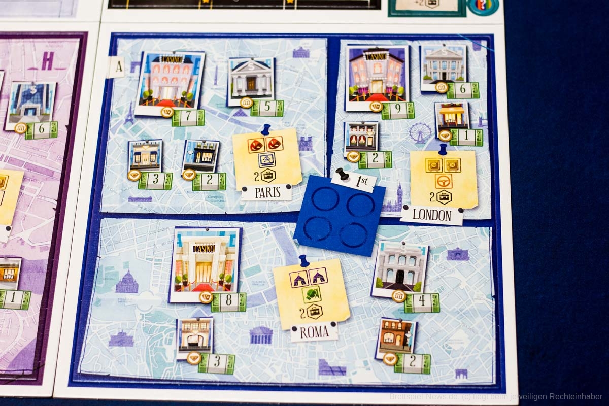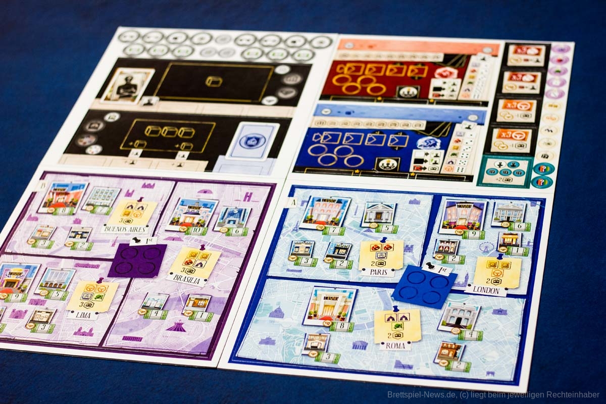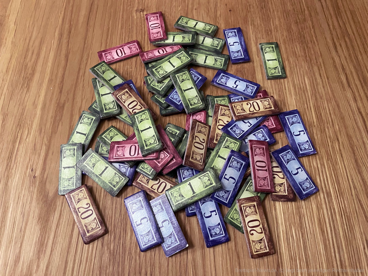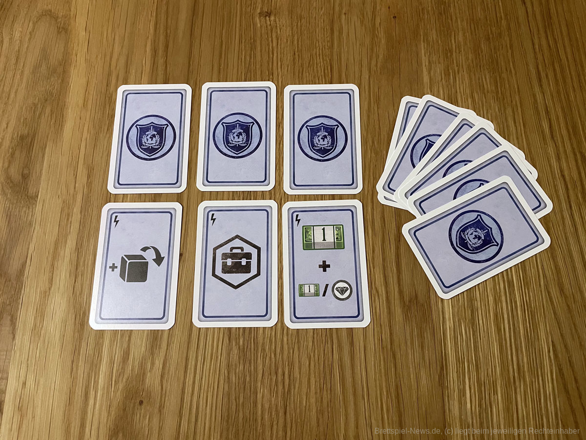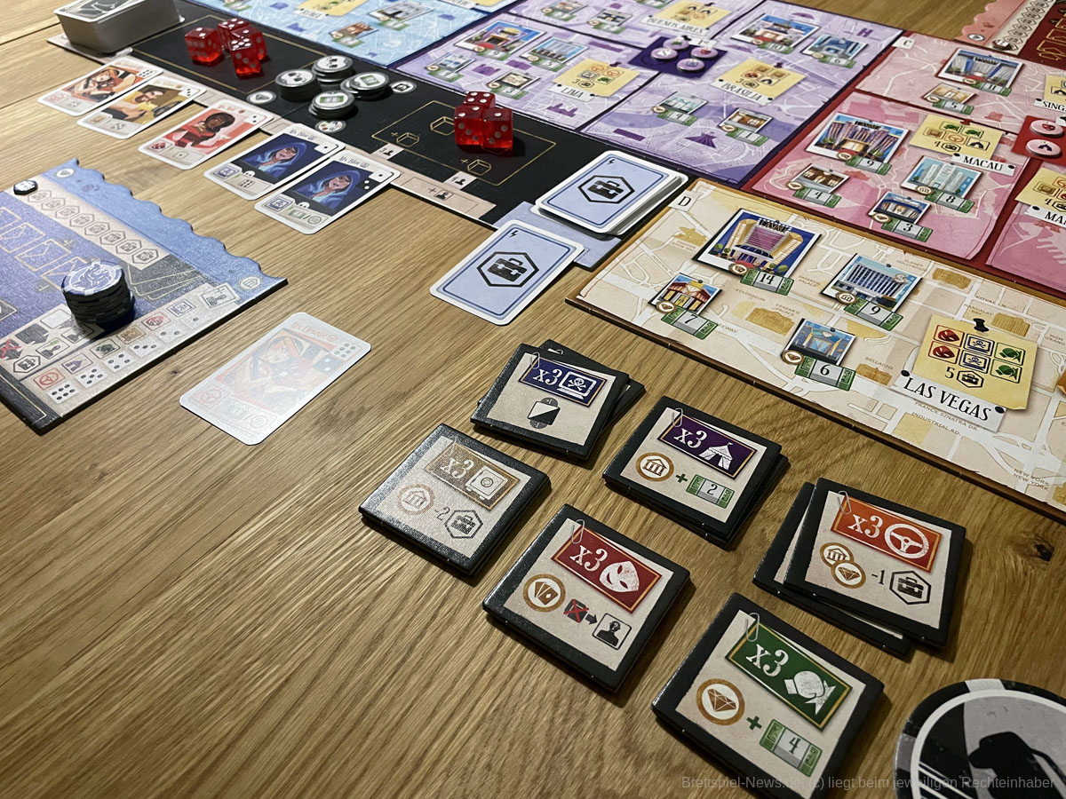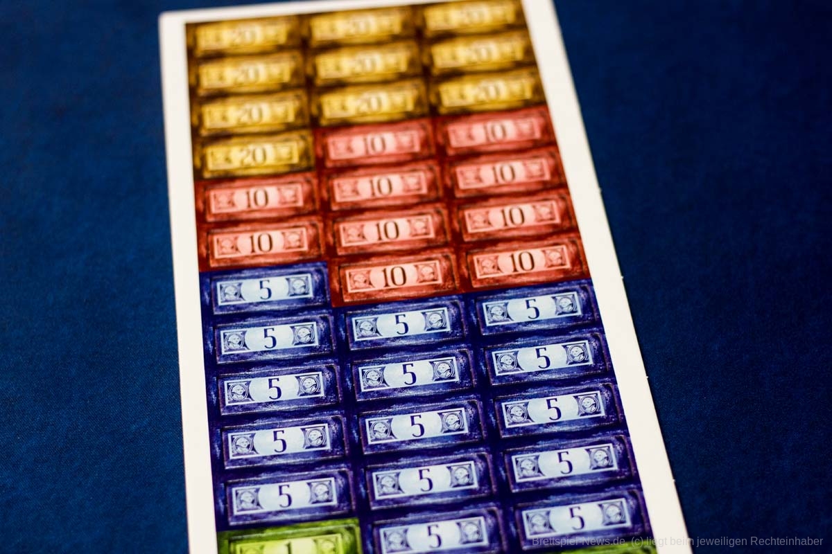 EXPLOR8 hat die Spielbox im Standardformat mit sechs Spielplanteilen und vier Spieler:innenboards aus stabiler Pappe gefüllt. Daneben befinden sich 21 rote Würfel und 28 Gangmarker, bei denen ebenfalls zur dicken Pappe gegriffen wurde. Um ausreichend Beute zur Verfügung zu haben, finden sich unter dem Spielmaterial 66 Banknoten mit unterschiedlichem Wert. 46 Pappmarker und insgesamt 98 handliche Karten komplettieren den Inhalt der Box.