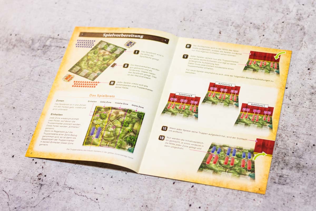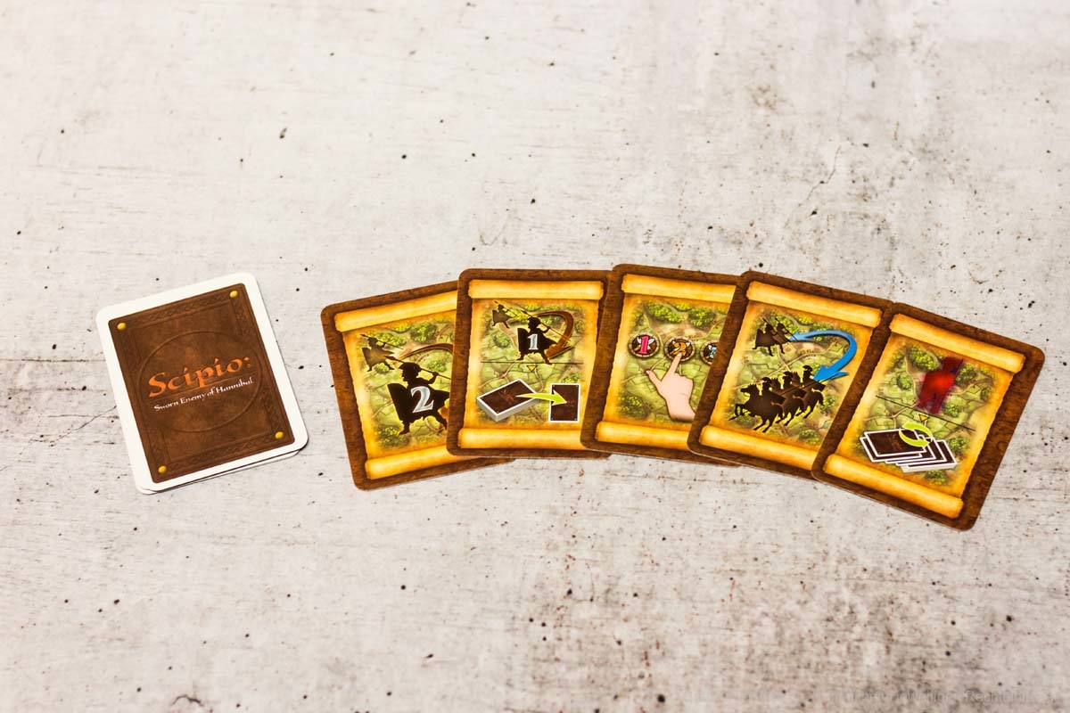 Was für die einen eine Stärke ist, kann aber für andere eine Schwäche darstellen. SCIPIO bleibt in einigen Bereichen sehr an der Oberfläche und geht wenig in die Tiefe der Thematik oder der Spielmechanik ein. In der Thematik des Spiels ist es schwer zu vermitteln, warum beide Armeen über die exakt gleiche Truppenstärke und Bewaffnung verfügen sollten, wohingegen das reale Vorbild ein komplett anderes Bild zeichnet. Das Thema zeigt sich hier leider nur in den Illustrationen der Handkarten und des Spielfeldes, wodurch es sehr austauschbar wird und durch jeglichen Krieg ersetzt werden könnte. Zusätzlich fehlen kleine Schnellreferenzen mit den wichtigsten Informationen, wodurch der Spielfluss anfangs immer mal wieder unnötiger Weise unterbrochen wird. Zwar lässt sich das mit den unterschiedlichen Regelbüchern provisorisch lösen, aber dennoch haben wir das als störend empfunden.