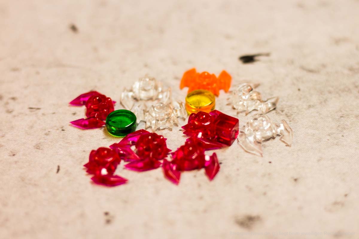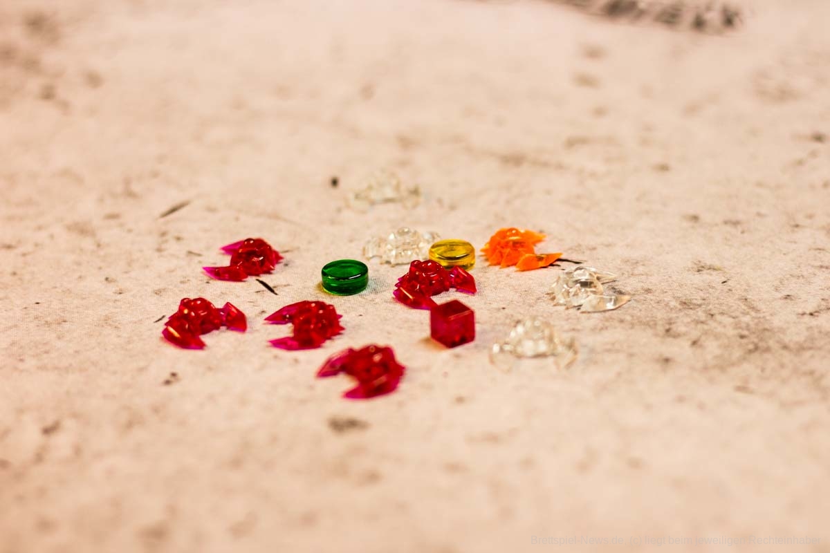 Die außerirdischen Schiffe wurden aus Acrylglas hergestellt und sind haptisch das Highlight des Spiels. Auch die beiden runden Marker für Beschädigung und Forschung sind aus Acrylglas. Die einzige Spielfigur auf Seiten der Menschen ist der Tunnelbohrer. Dieser ist aus Holz und erledigt solide seinen Job.