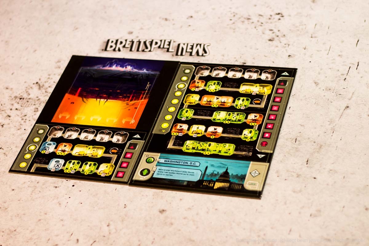 Darunter wird eines der Stadtplättchen gelegt, das eine dauerhafte Sonderfähigkeit bietet. Die Rückseiten zeigen eine bereits zerstörte Stadt mit einer etwas stärkeren Fähigkeit, womit ebenfalls der Schwierigkeitsgrad angepasst werden kann.