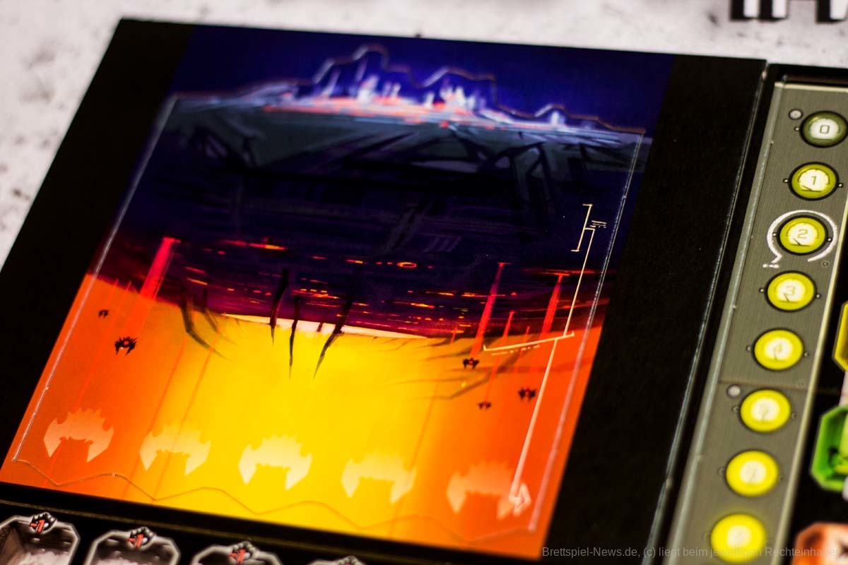 Auch die Optik des Spiels finde ich überaus gelungen. Die Ikonografie stört nicht und ist absolut selbsterklärend. Das Mutterschiff sieht nicht nur super aus, sondern gibt dem Spiel einen Timer und damit den nötigen und thematisch passenden Druck, sich zu entscheiden.