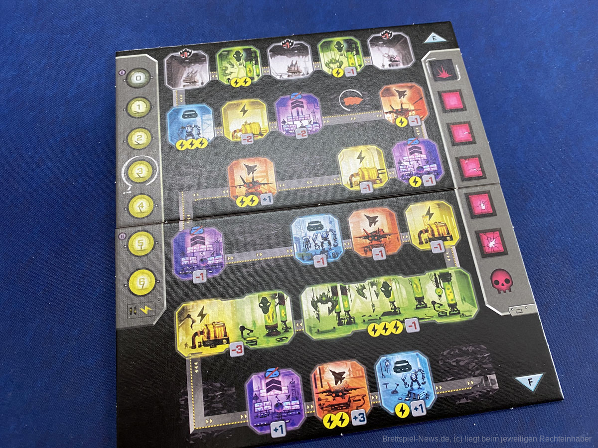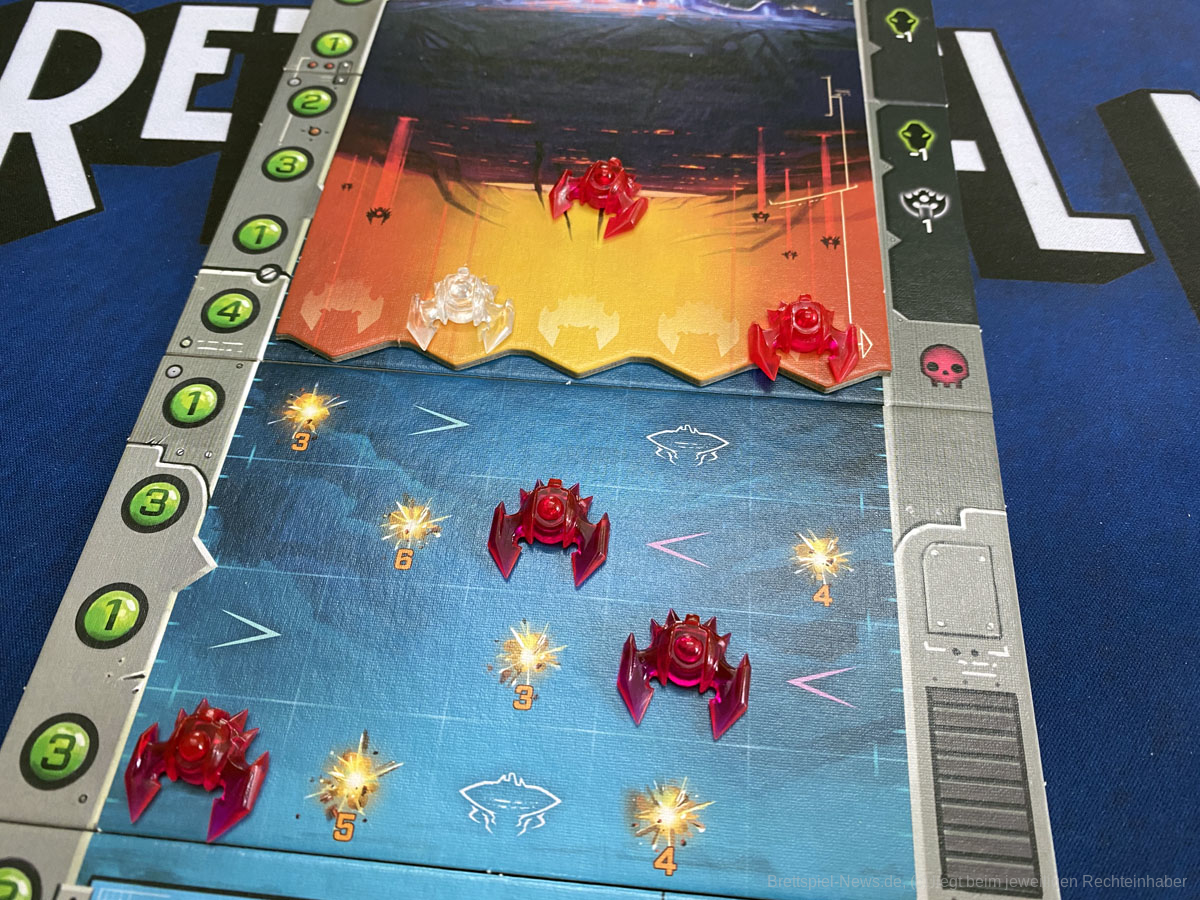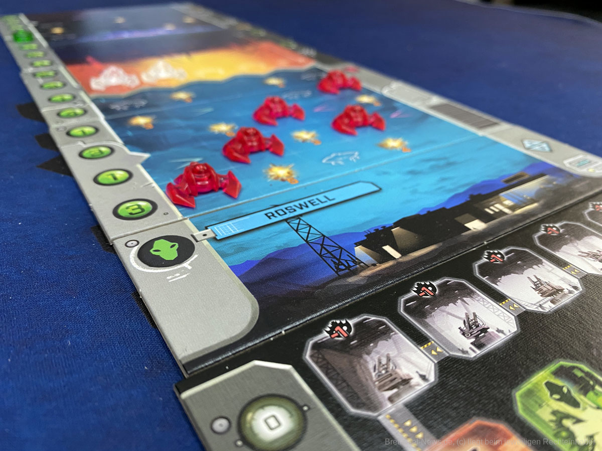 Das Spielbrett zeigt nun eine lange Angriffslinie der Außerirdischen und den Stützpunkt der Menschen, beides in fünf Spalten aufgeteilt.
