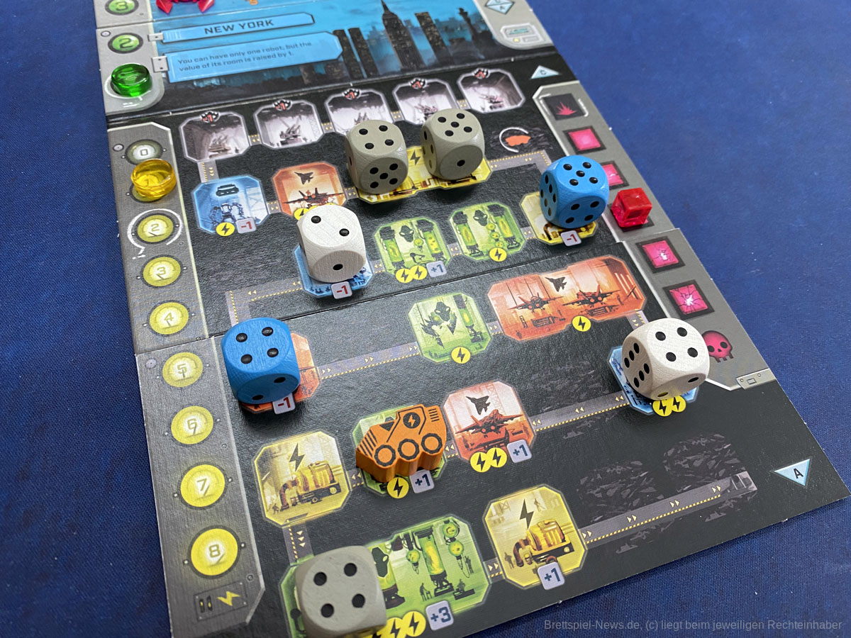 So einfach ist es dann allerdings doch nicht. Nicht immer zeigen die Würfel die Werte, die gebraucht werden. Nicht immer gibt es Luftabwehrfelder, die genutzt werden können – vor allem mit den schwierigeren Rückseiten der Luftraumplättchen. Und nicht immer lassen die Fähigkeiten der gewählten Stadt die gleiche Strategie zu.