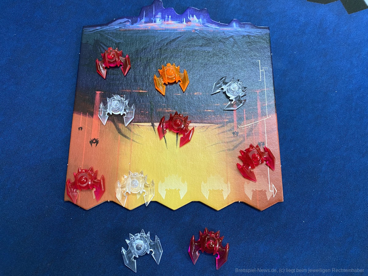 Einer nach dem anderen wird auf die Raumfelder des Stützpunktes gesetzt, um die entsprechenden Aktionen in der zweiten Phase auszuführen zu können. Die dritte Phase gehört den Invasoren, deren Mutterschiff sich auf die Basis zubewegt und dabei negative Effekte auslöst.