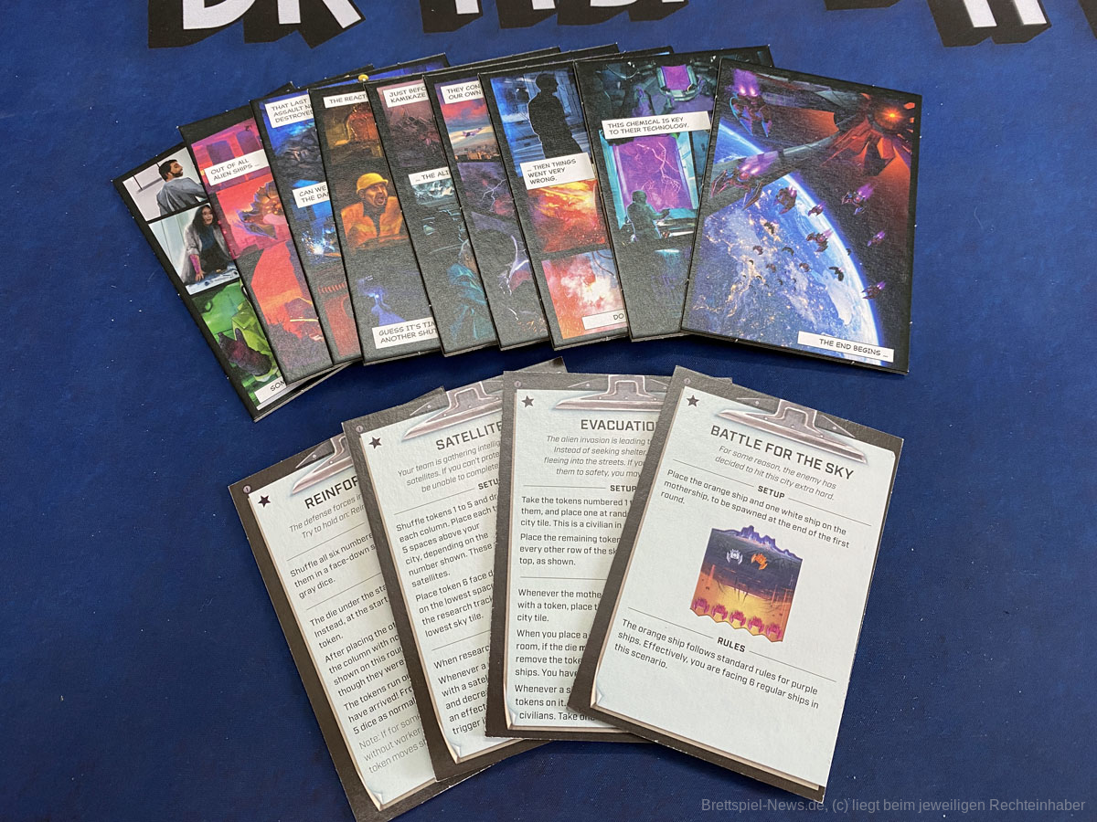 UNDER FALLING SKIES bietet neben dem freien Spiel auch die bereits angesprochene Kampagne. Sie erzählt über vier Kapitel die Geschichte der Invasion und hebt den Schwierigkeitsgrad dabei immer weiter an. Außerdem werden neue Sondereffekte und Aktionsmöglichkeiten vorgestellt, die das Spiel erweitern.